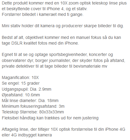 This product comes with a 10X zoom optical telescope lens plus a protective cover for iPhone 4, and a tripod.
