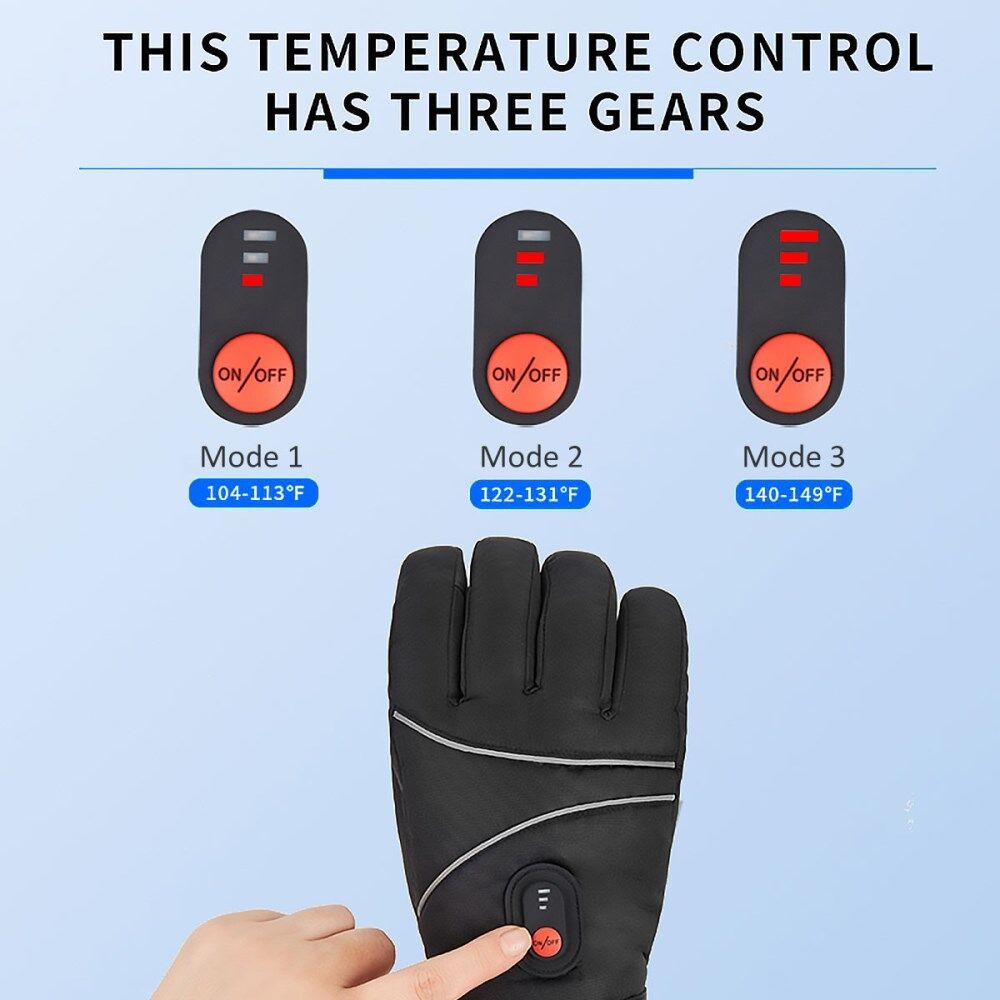 • 3s Fast Heating, 3 Levels of Heating Settings: Fast heating function, no preheating, feel warm within 3s. Warm gloves have 3 levels of heating adjustable settings: 3 levels: high temperature (60-65°C); 2 levels, medium temperature (50-55°C); 1 level, low temperature (40-45°C)