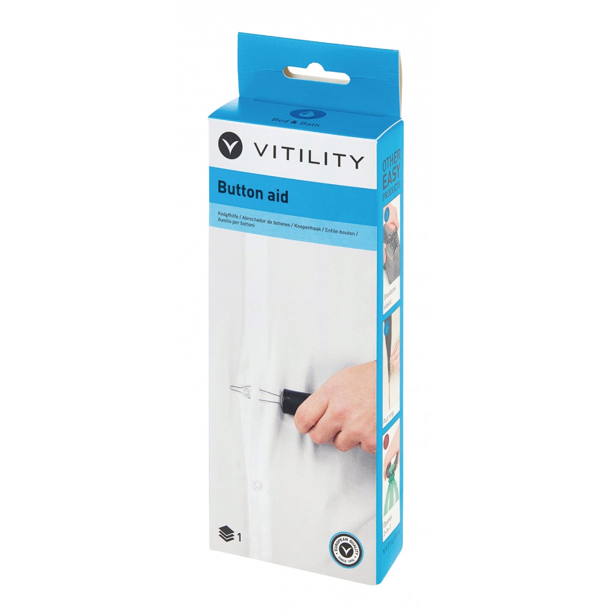 With the button aid it becomes easier to button clothes with the use of only one hand. The comfortable handle of the button aid is thickened (Ø 3.5 cm / 1.4 inch) and made of soft material.