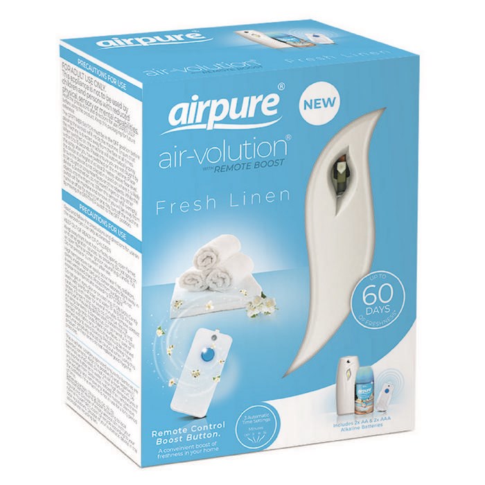 The package contains Airpure Freshmatic Air Volution Air Freshener with Remote Control