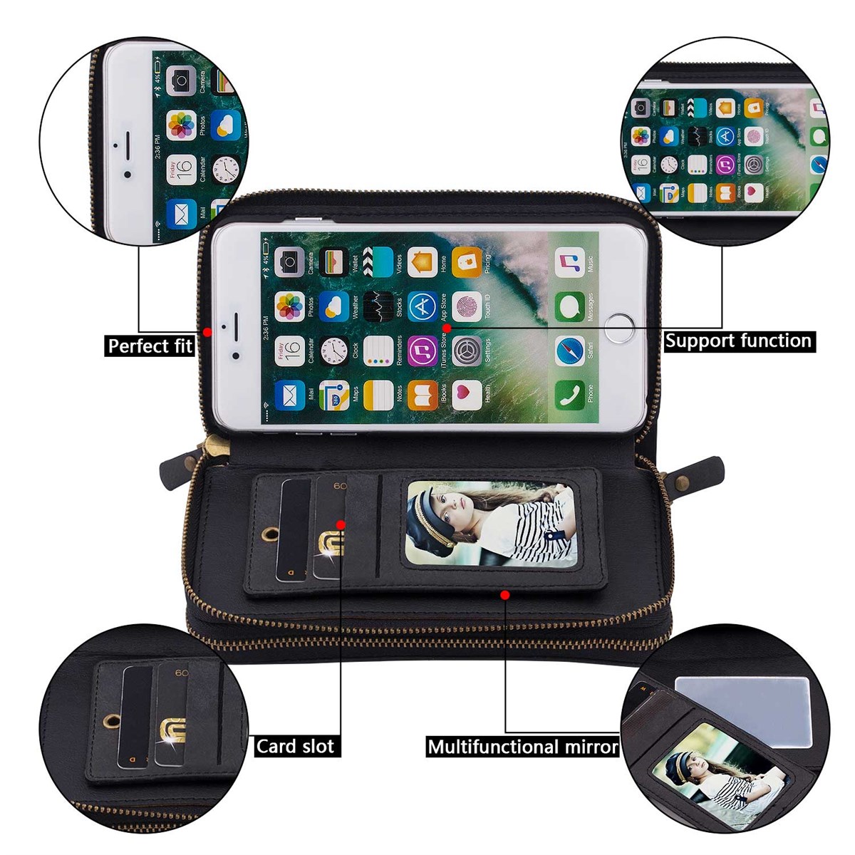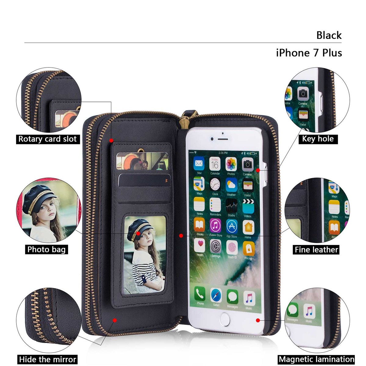 A multifunctional design of a Wallet and Cover for your iPhone 7 plus with magnetically removable back cover. The wallet is super smart with handles, an exterior clear pocket for photos and 2 compartments with a zipper, one for money and cards as well as one for your iPhone, which has an integrated mirror. The back cover is magnetic, easy to remove, and has a cutout for the camera, buttons and power connectors.