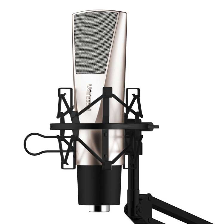 The elastic holder can be mounted on a microphone arm and can be adjusted in the holder in a position for the best sound reproduction.