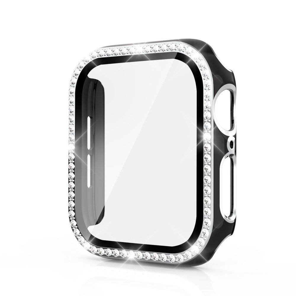Bi-Color Electroplating Rhinestone Crystal PC Case Cover with Tempered Glass Screen Film for Apple Watch 4/5/6/SE 44mm - Black / Silver