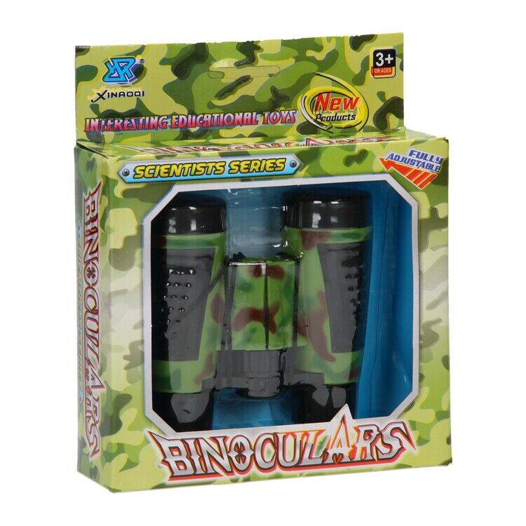 Plastic camouflage binoculars with cord to hang them around your neck.