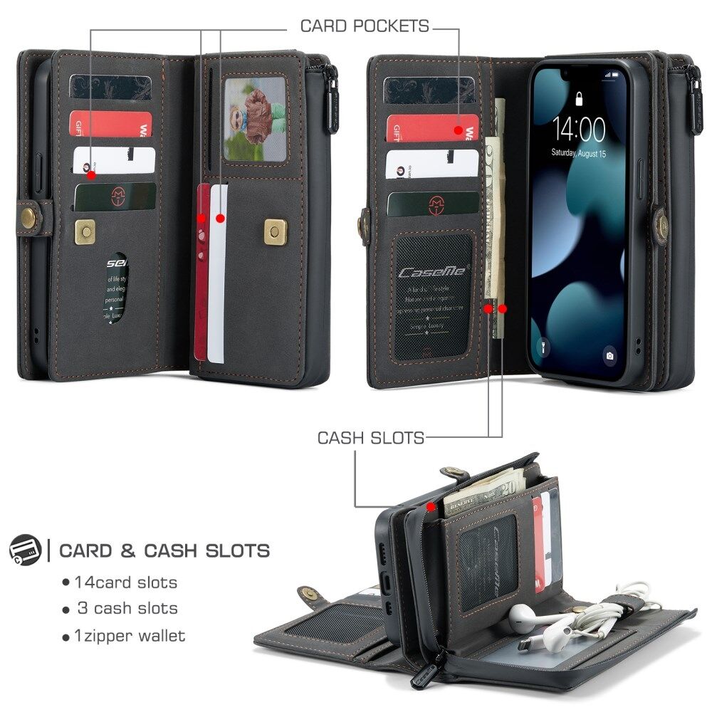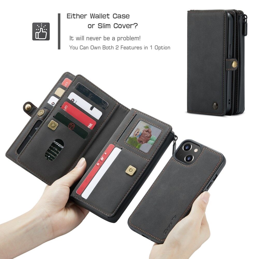 CASEME 018 Series Matte Surface Multi-Slot Design Leather Wallet Stand 2-in-1 Detachable Mobile Phone Cover Case for iPhone 13 mini 5.4 inch - Black