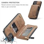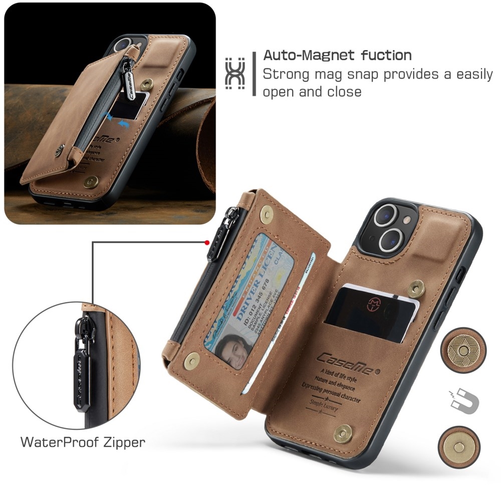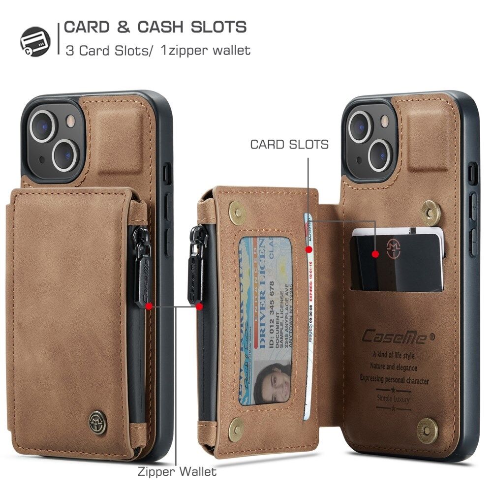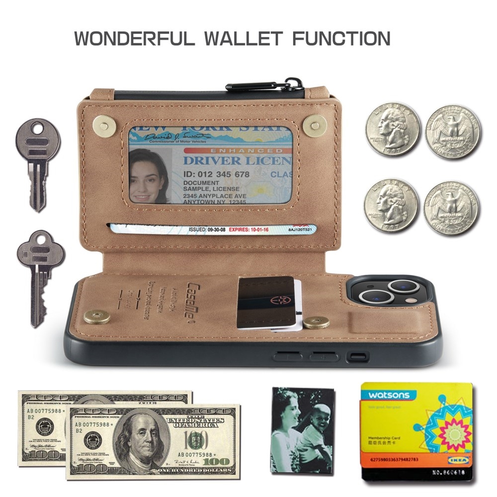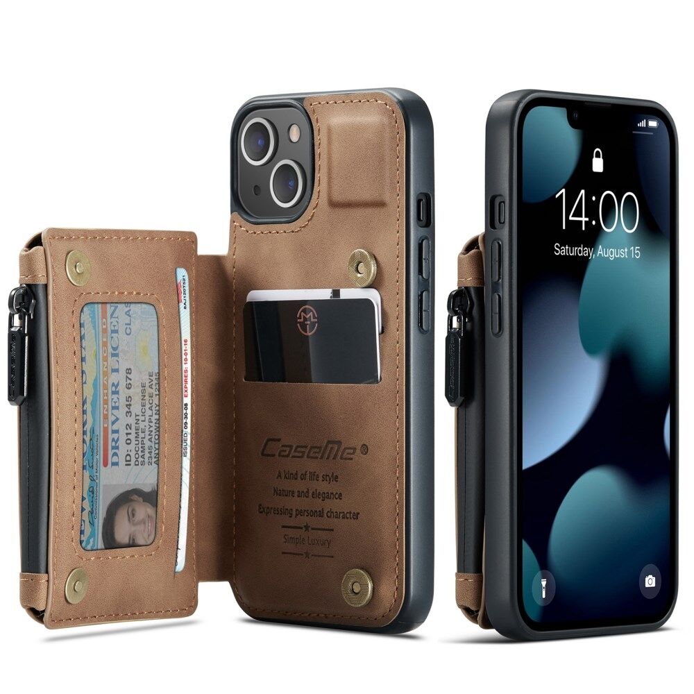 CASEME C20 Series Shockproof Anti-theft Zipper Pocket Wallet Design PU Leather and TPU Back Cover Phone Case for iPhone 13 6.1 inch - Brown