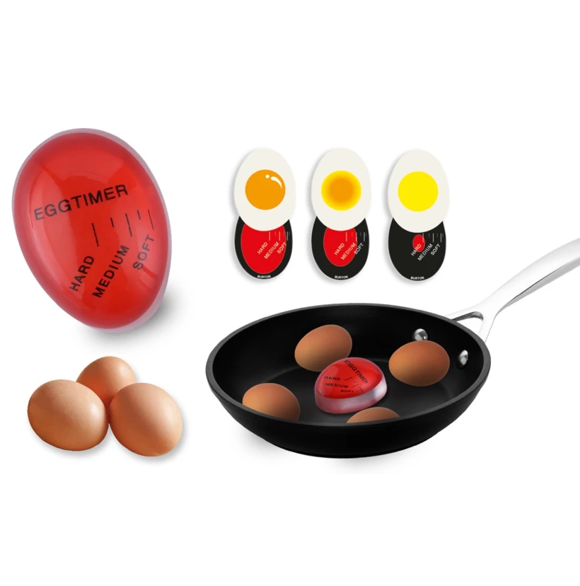 Place the egg timer in boiling water with the eggs, and the egg timer changes color when the eggs are soft, medium or hard.