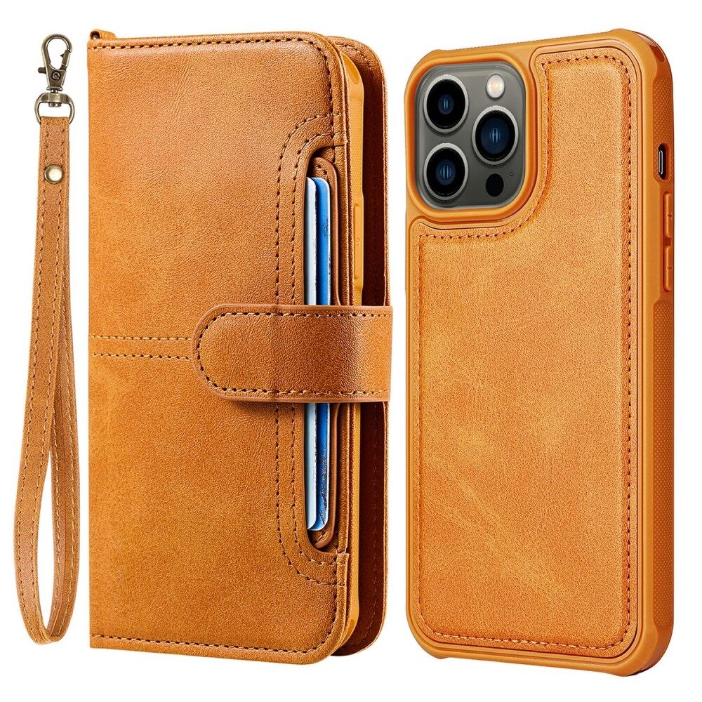 Detachable 2-in-1 Anti-Drop Button Closure Wrist Strap Multiple Card Slots Design Wallet Stand PU Leather Phone Case for iPhone 13 Pro 6.1 inch