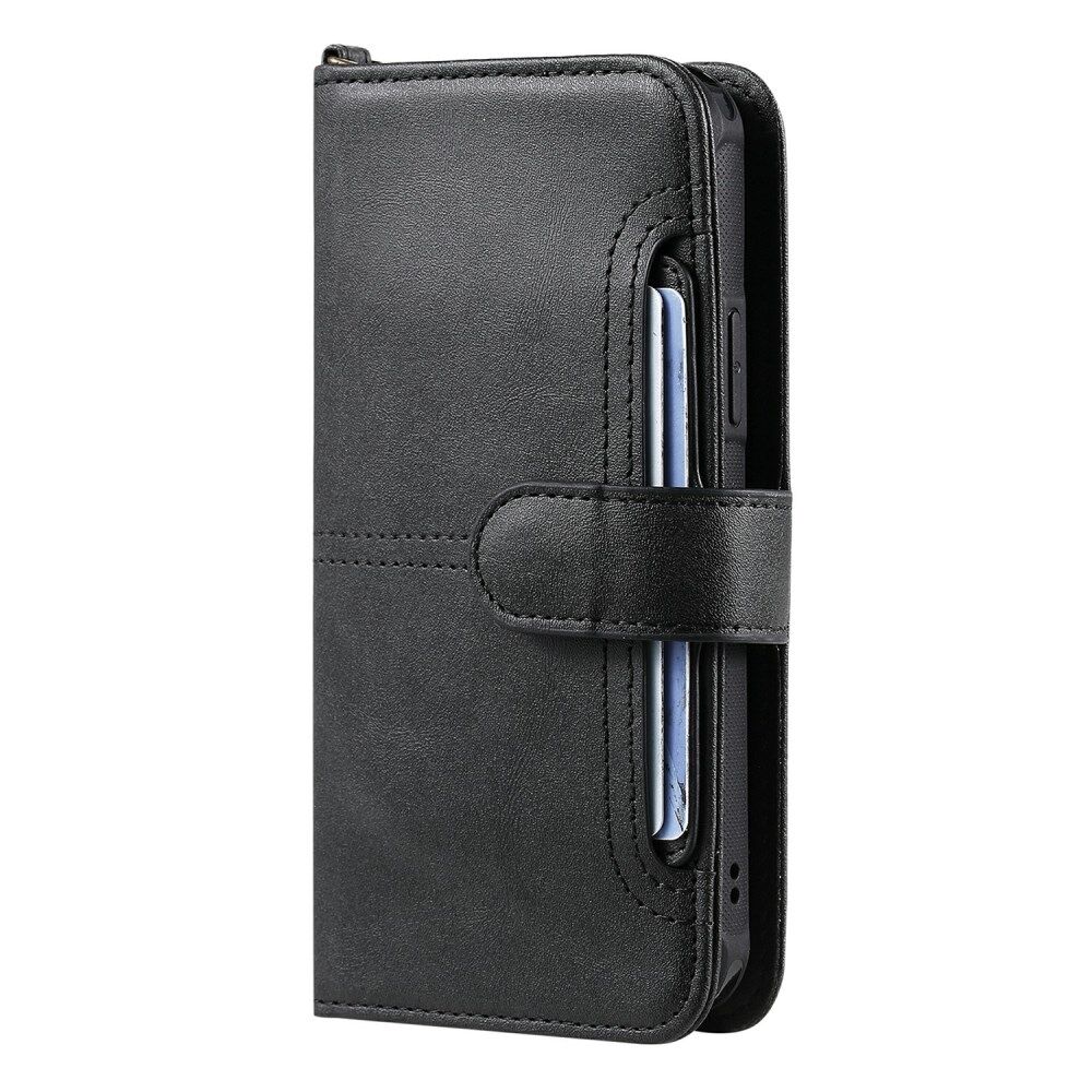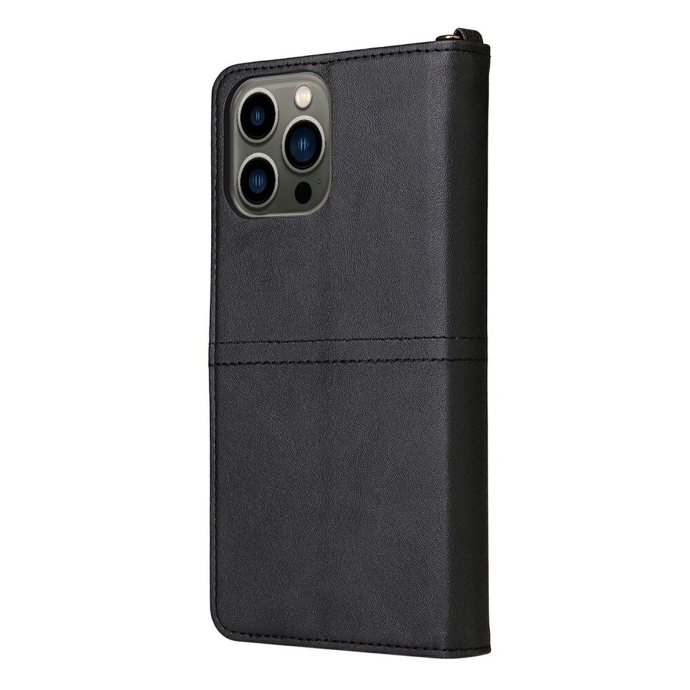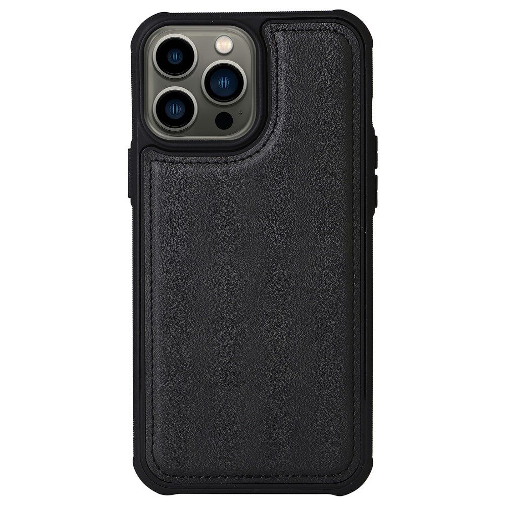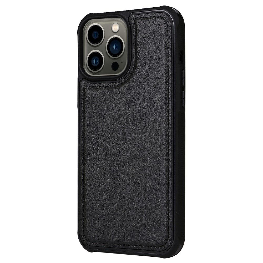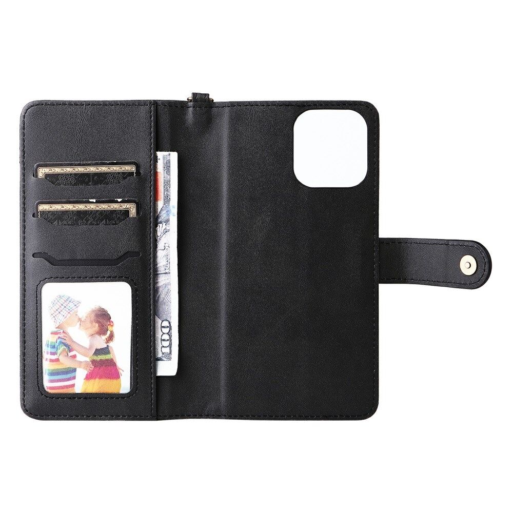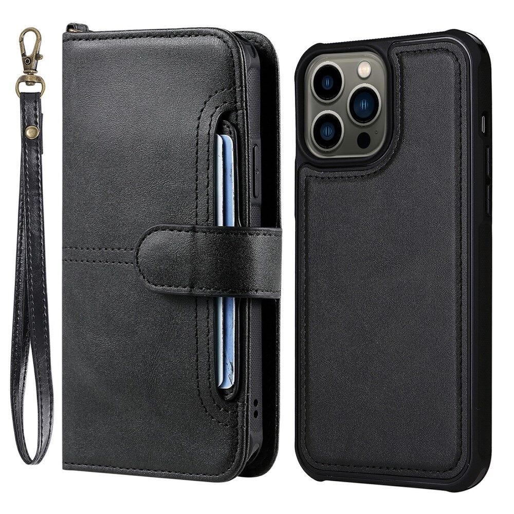 Detachable 2-in-1 Anti-Drop Button Closure Wrist Strap Multiple Card Slots Design Wallet Stand PU Leather Phone Case for iPhone 13 Pro 6.1 inch - Black