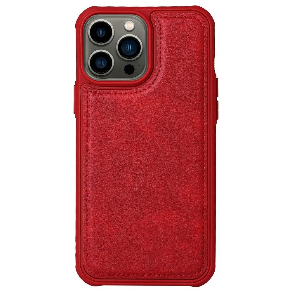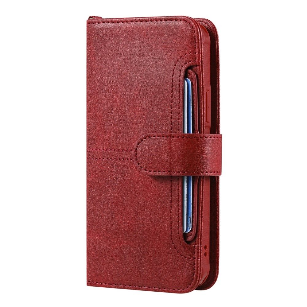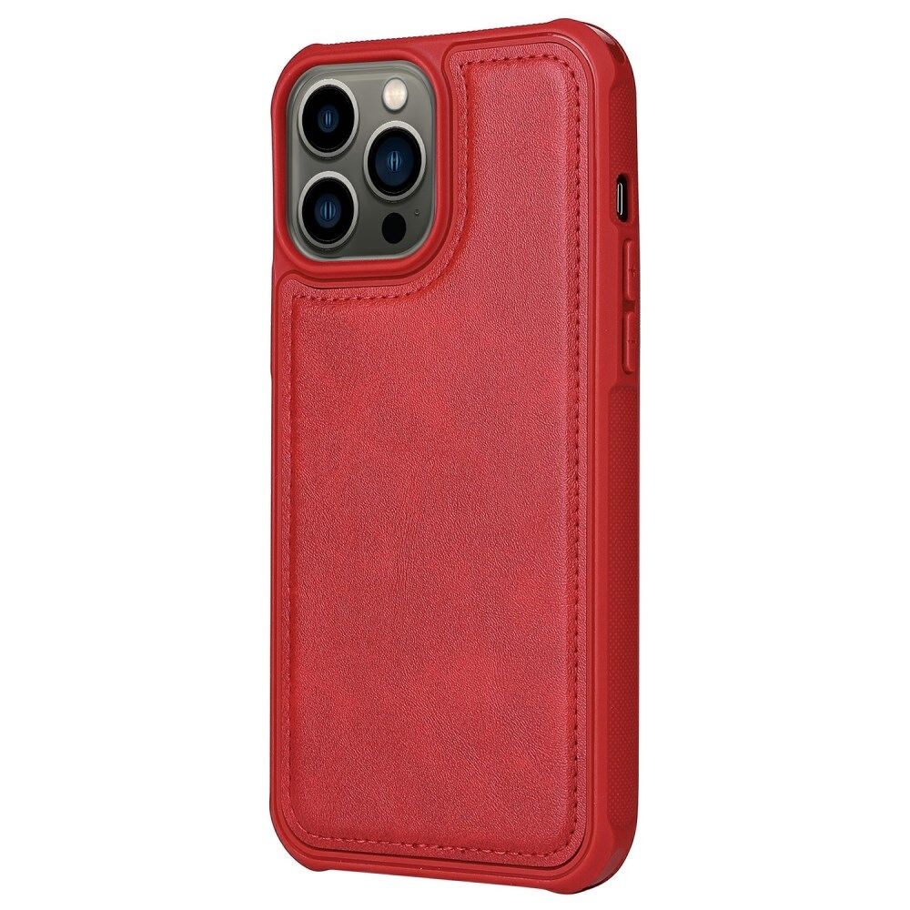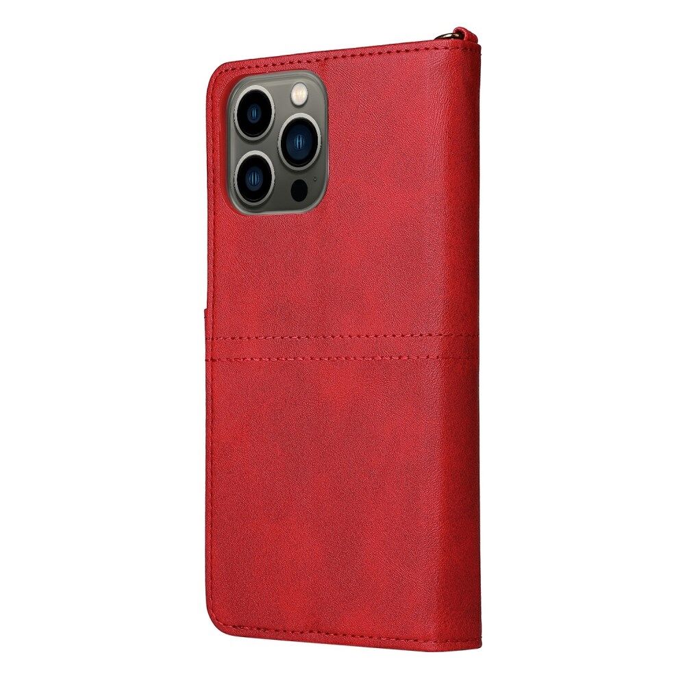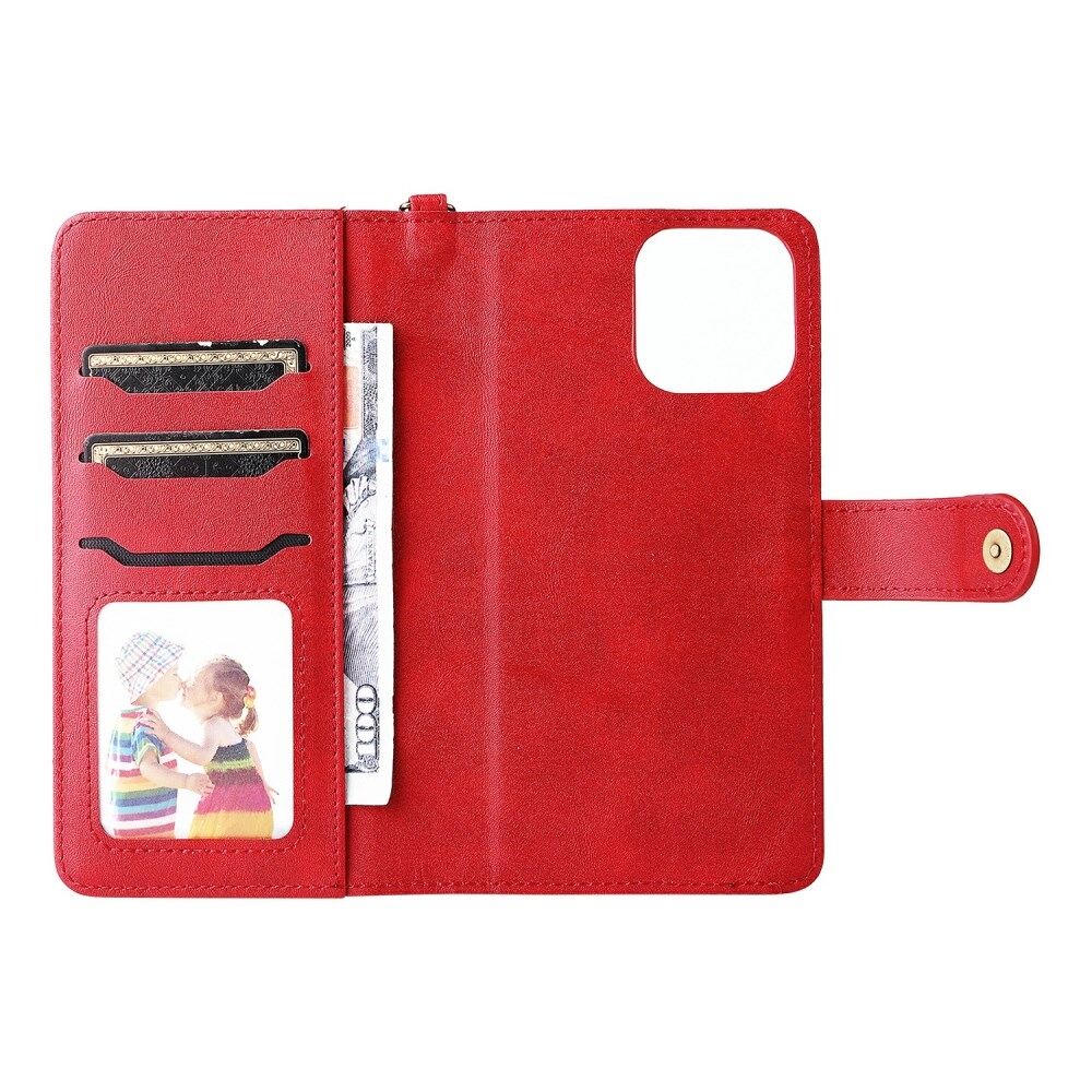 Detachable 2-in-1 Anti-Drop Button Closure Wrist Strap Multiple Card Slots Design Wallet Stand PU Leather Phone Case for iPhone 13 Pro 6.1 inch - Red