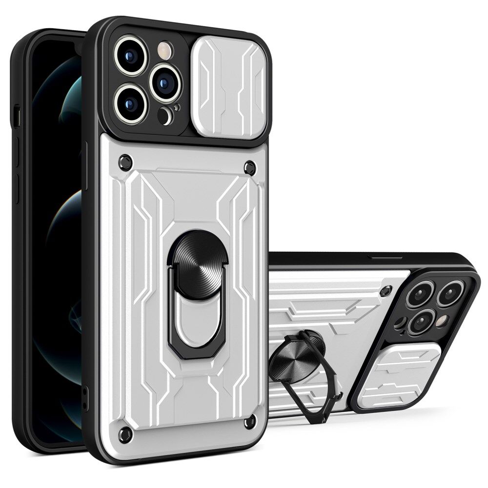 Detachable Card Slot Hard PC + Soft TPU Phone Case Kickstand Hybrid Cover with Camera Slide Cover for iPhone 13 Pro 6.1 inch - White