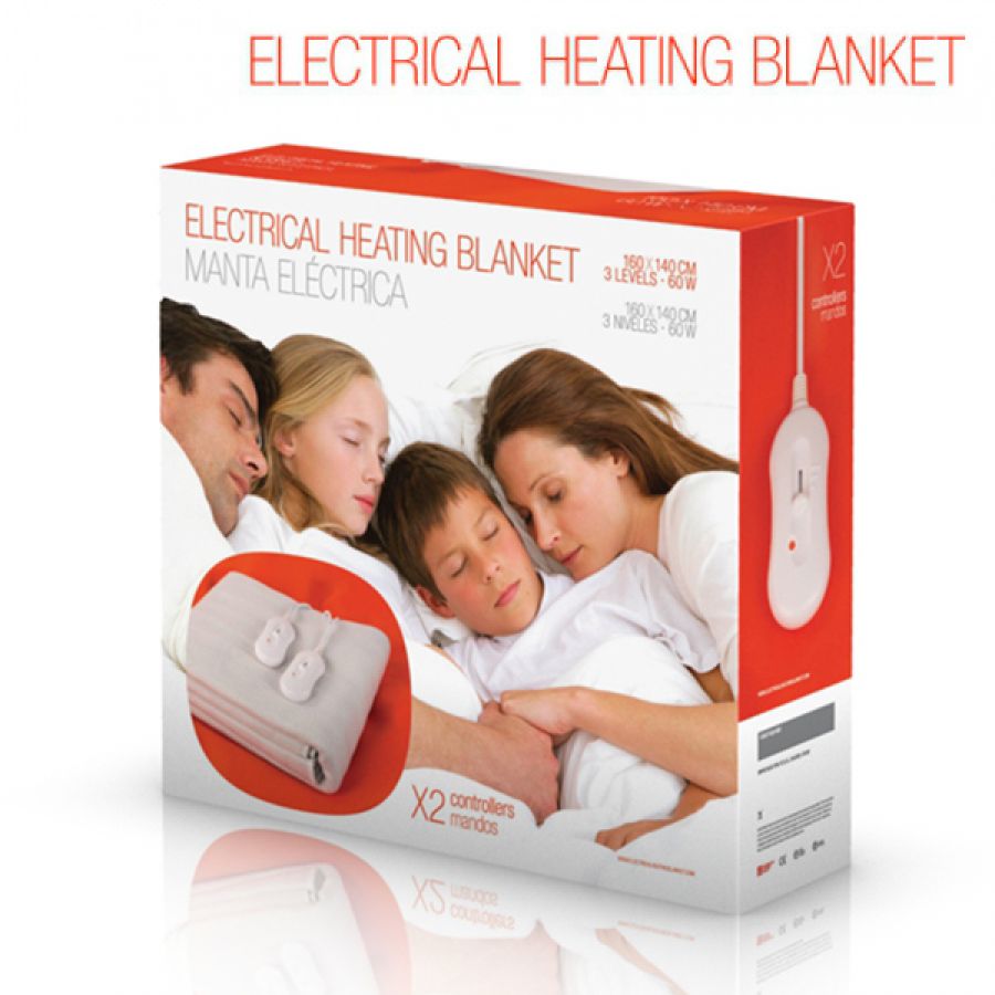 A double heating blanket in 100% soft polyester material measuring 140 x 160 cm.