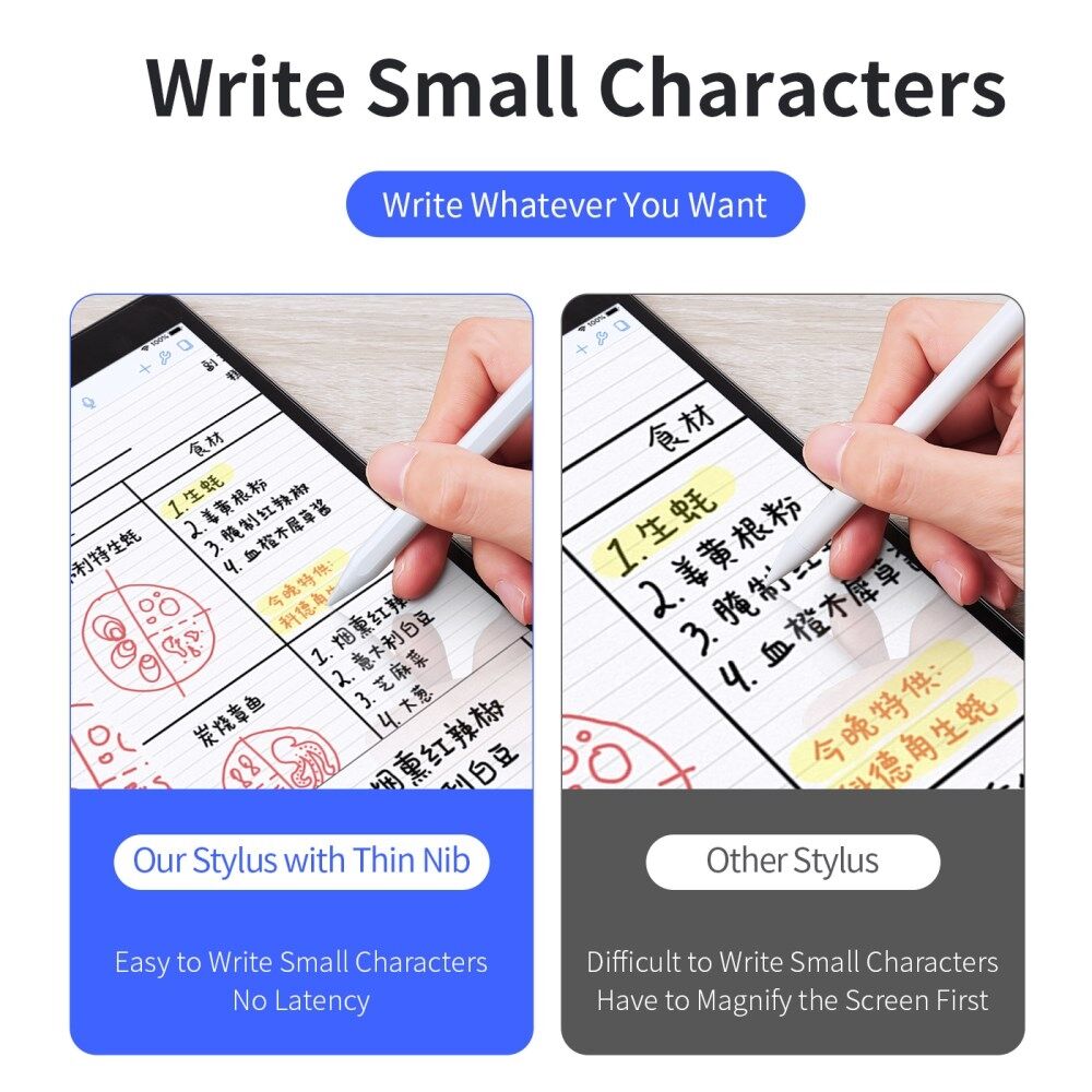 Distinctive palm rejection design allows you to write smoothly even your hands stay on the screen while writing and drawing. Superconducting nano nib provides pixel-perfect precision of writing and drawing. Pen-like design and matte finish surface make it comfortable to hold. Just double-pressing the top, you can start your creation journey, simple and easy to use.