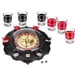One glass holds 0.2 cl and each glass is printed with numbers (1-6, 7-12, 13-18, 19-24, 25-30, 25-30, 31-36). The winner is the one whose glass has the number in which the bullet lands. However, it cannot go wrong with 0.2 cl shots of glass, you have to press the button many times before you go under the table.
