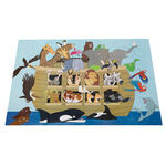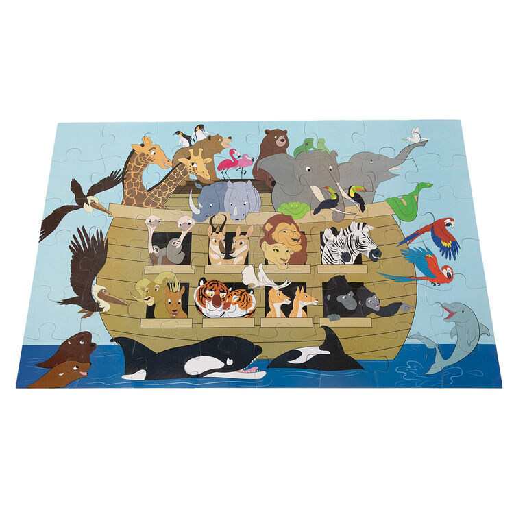 This mega puzzle of 48 pieces shows you all kinds of different animals on Noah's ark. Which animals do you see? The size of the puzzle is 90 by 60 centimeters, the puzzle pieces are approximately 16 by 13 centimeters.