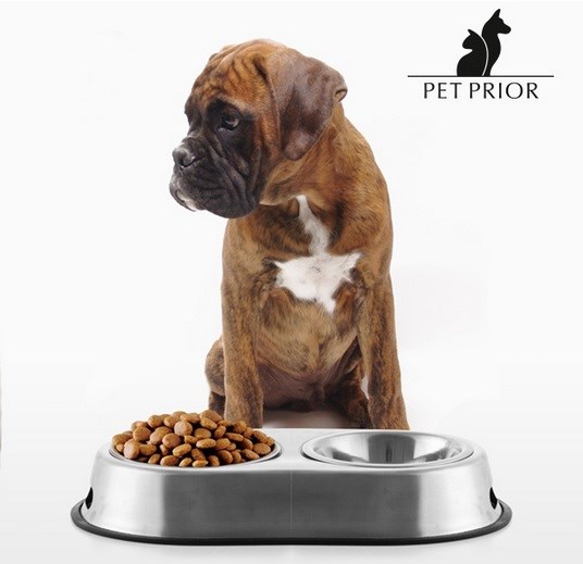 A feedable with 2 removable stainless steel bowls. The bowls have a diameter of 15 cm and each contain 600 ml.
