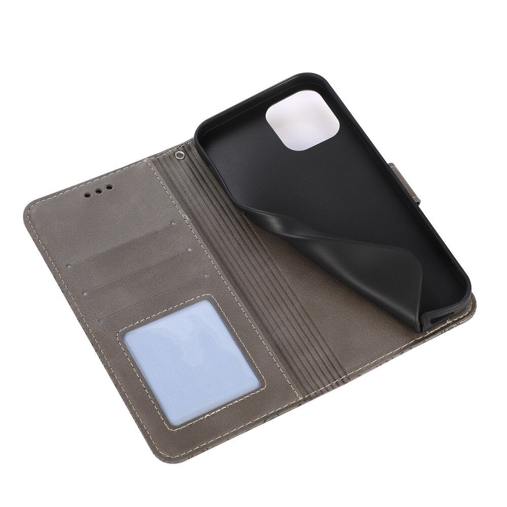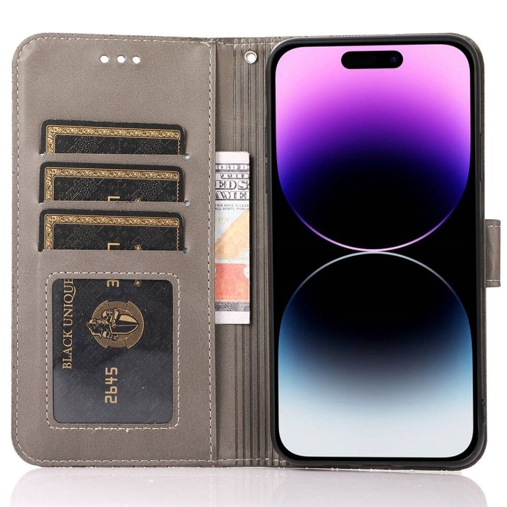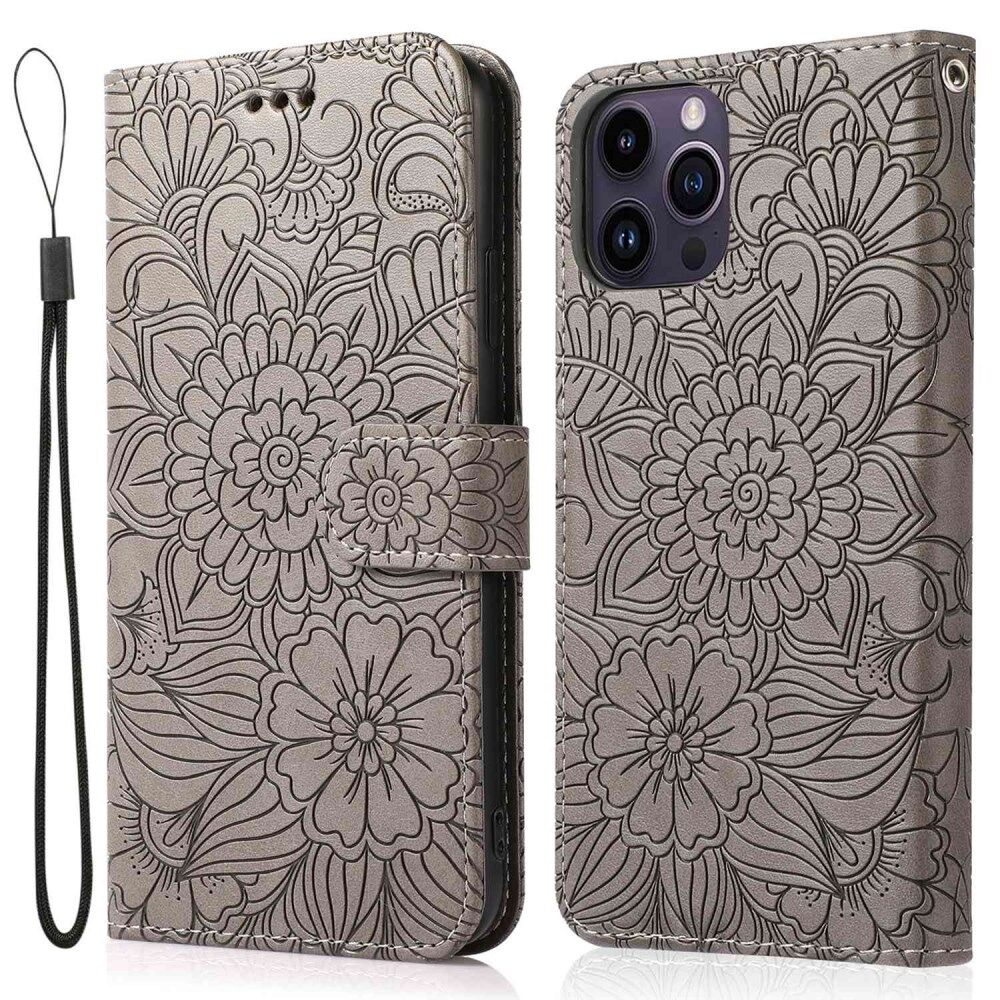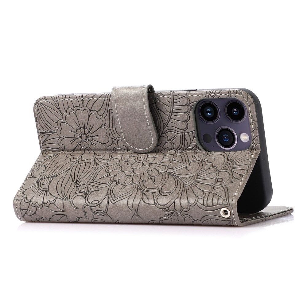 For iPhone 14 Pro Anti-scratch Wallet Case Imprinted Flower Pattern PU Leather Stand Phone Shell with Strap - Grey