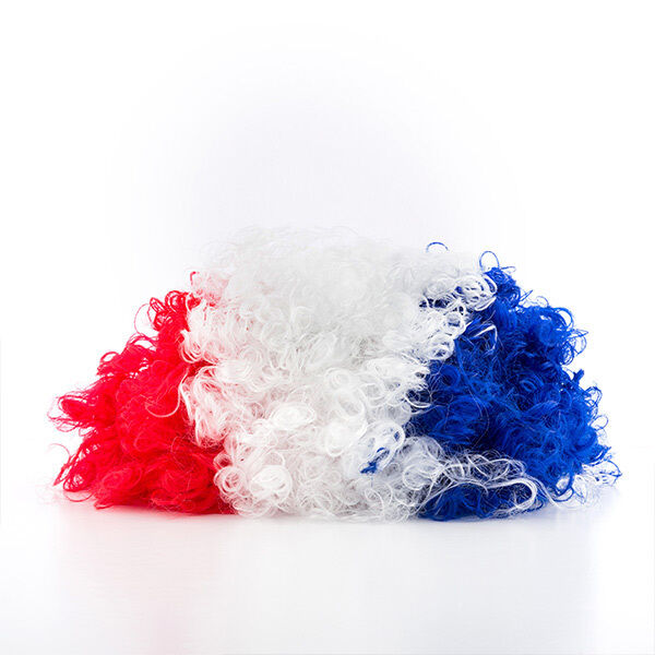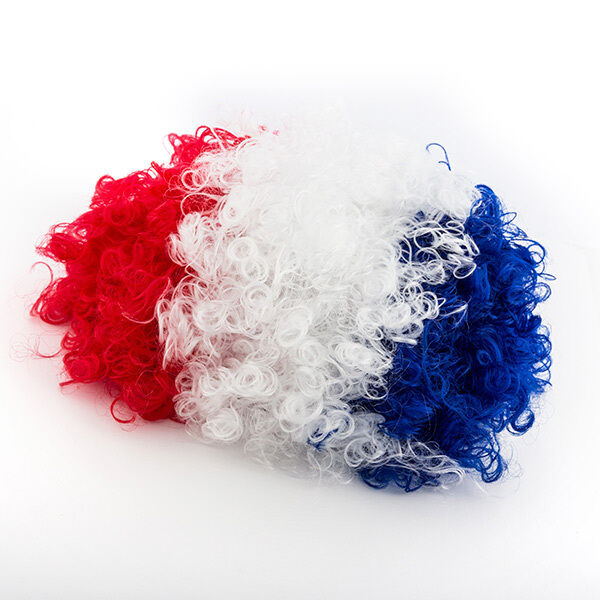 Cheer on the French team with the funny and showy French Flag Afro wig! It is also perfect as a costume for any party or celebration. It is elastic and easy to adjust on the head. Made of synthetic fibres.