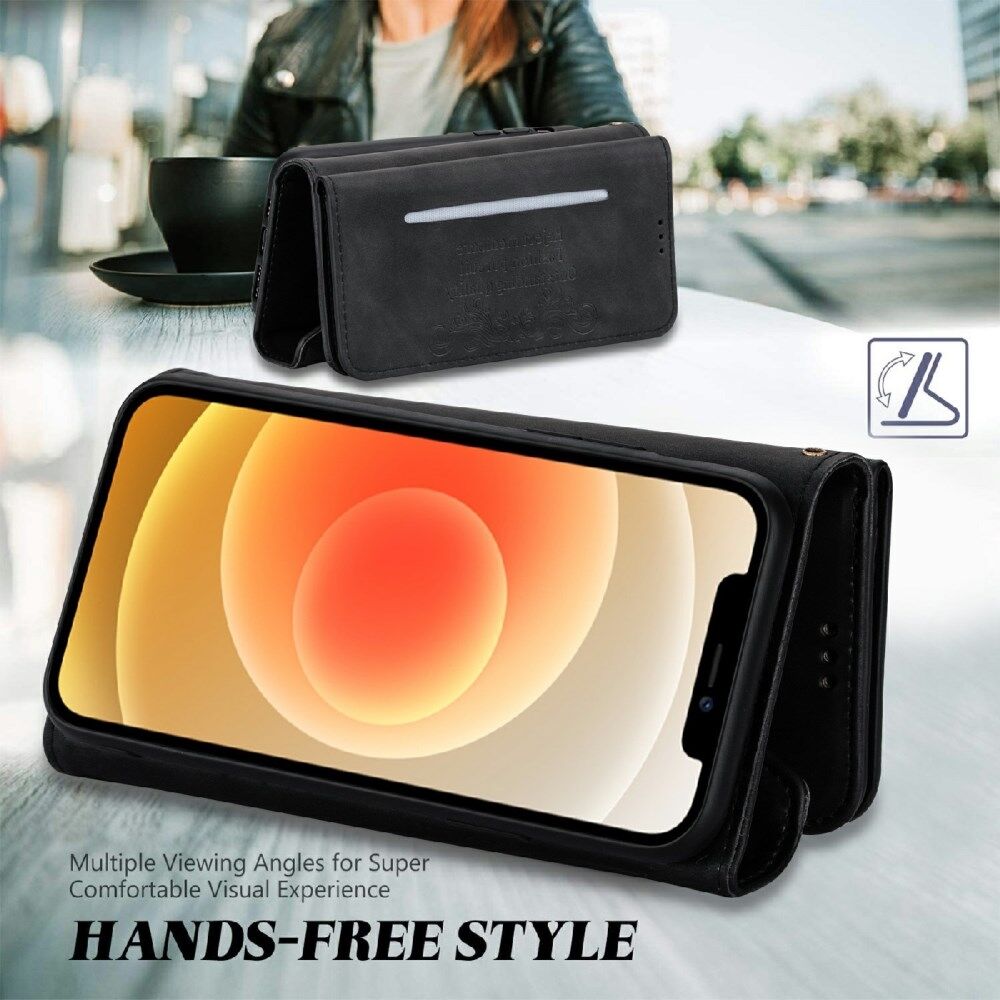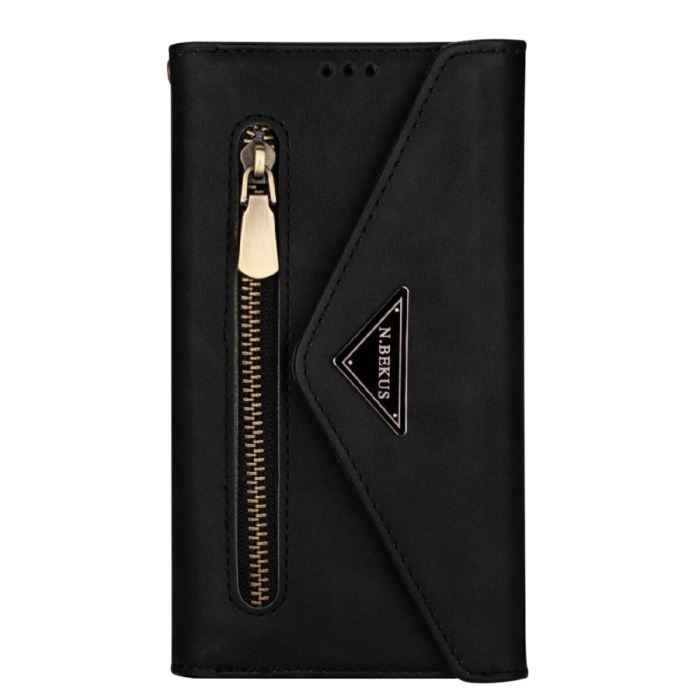Full Protection Leather Zipper Wallet Design Skin Feeling Phone Case with Stand and Strap for iPhone 13 mini 5.4 inch - Black