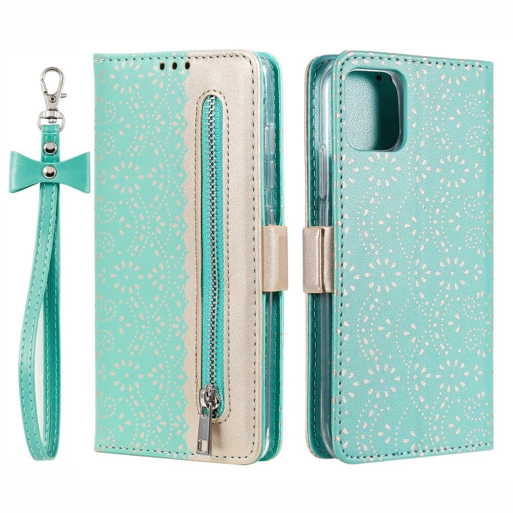 Full Protective Anti-drop Zipper Wallet Lace Leather Case for iPhone 13 mini 5.4 inch - Green