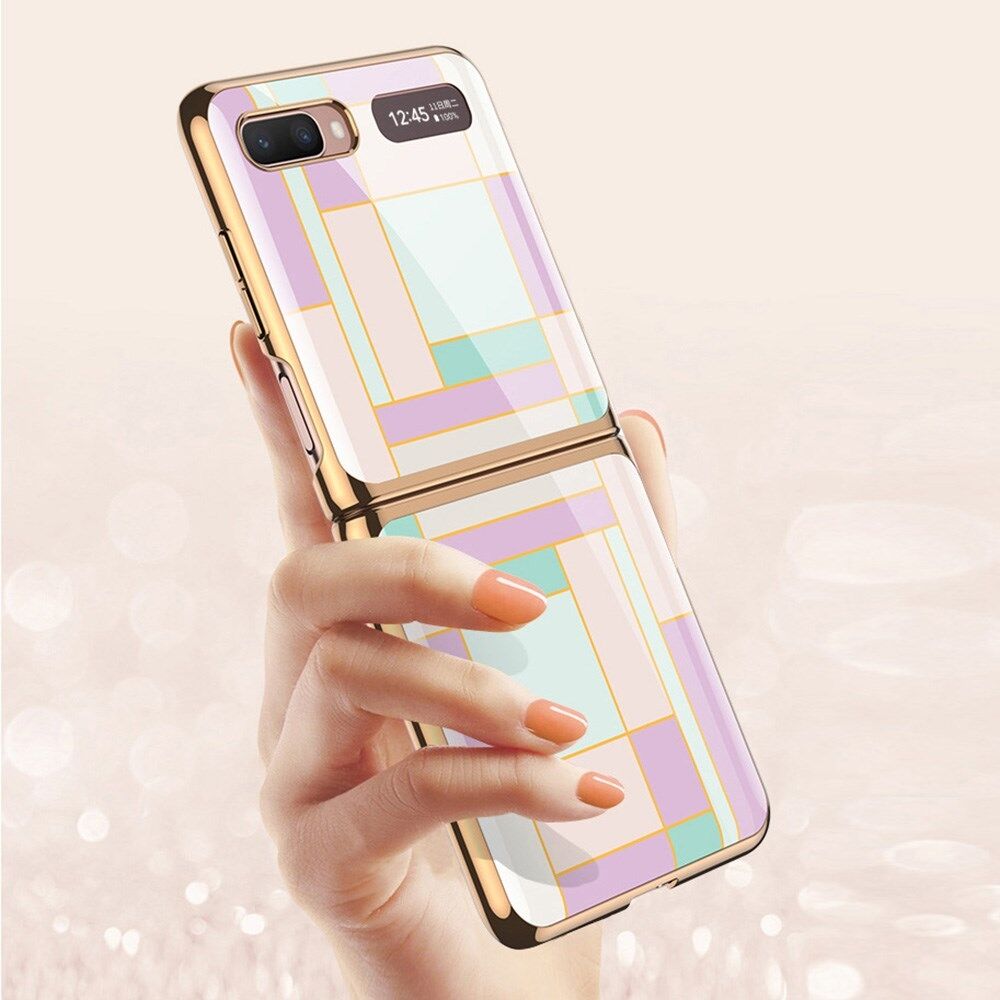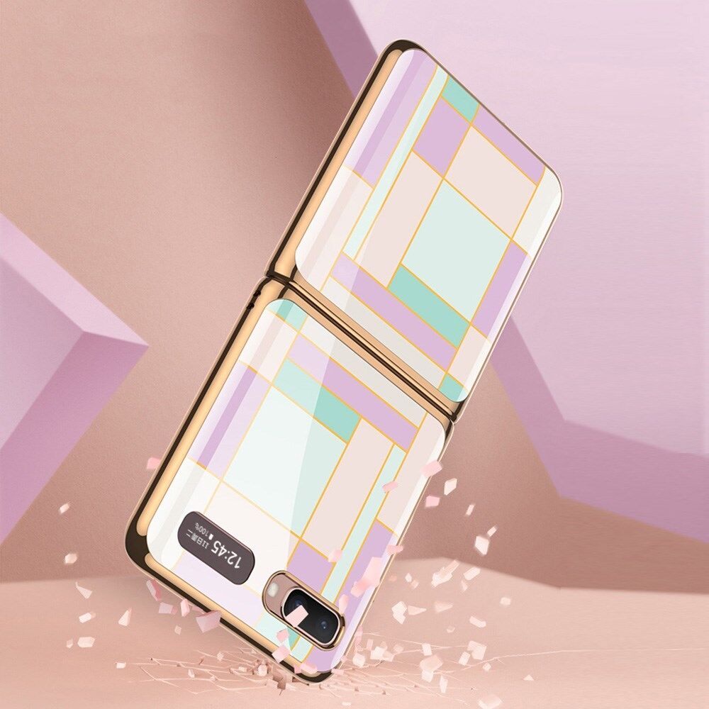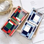 GKK Folding Plating Pattern Printing Shell Tempered Glass + PC + TPU Hybrid Cover for Samsung Galaxy Z Flip 5G - Purple/Cyan Grid