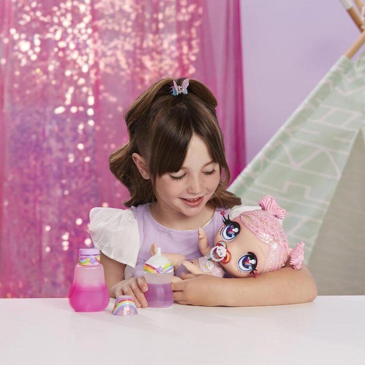 Follow the sparkle to the sunset and turn left at the moon to discover the magical world of the Glitter Babyz. Glitter Babyz are super beautiful, glittering and magical babies with cute big eyes, sparkling eyelashes and glitter in their hair. each baby has a unique personality that is reflected in her style. They have 3 magical color-changing effects: (1) her hair color changes over and over when you put her in the bath (bathtub sold separately); (2) the magic shampoo bottle changes color every time you add ice cold water to it; (3) and add ice cold water to the juice bottle to make it magically change color over and over again. Love your doll and take care of her to keep her magic alive and glittering. Give her her bottle, change her diaper, give her a bath (bathtub sold separately), then lay her down for a nap. You can care for and pamper your baby again and again. All accessories of your magical Glitter Babyz are reusable, from her bottles to the diapers. Includes removable T-shirt, reusable glitter diaper, pacifier, juice bottle with magic color change effect, shampoo bottle with magic color change effect, glittering baby with hair that changes color. Adopt all four babies today: Dreamia Stardust, Melody Highnote, Marina Finley and Selena Stargazer are ready to come home with you. Keep an eye out for their unicorn friends, they are coming soon!