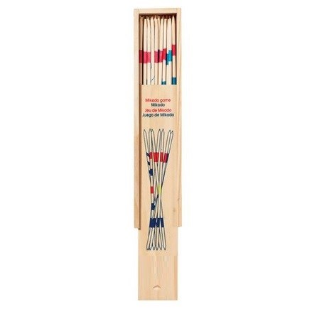 It is played with sticks of different point value, there are 41 sticks of about 17 cm in length. One of the sticks is the so-called Mikado (from the Emperor of Japan) It is the only stick that is just one of the spiral stripped in blue.