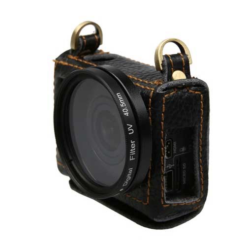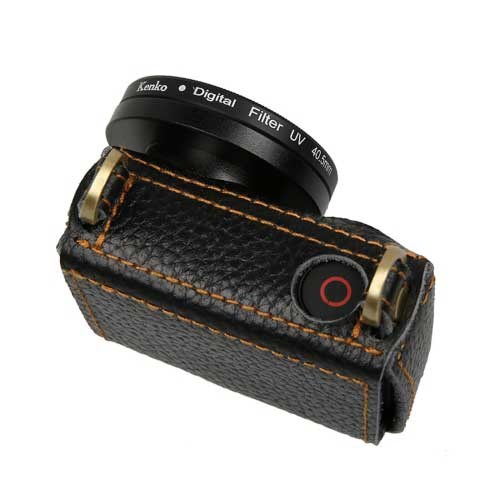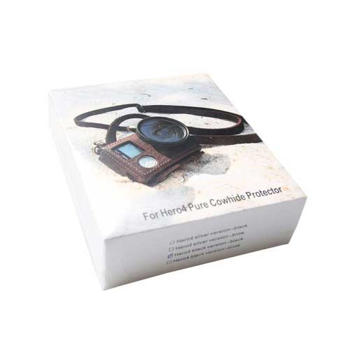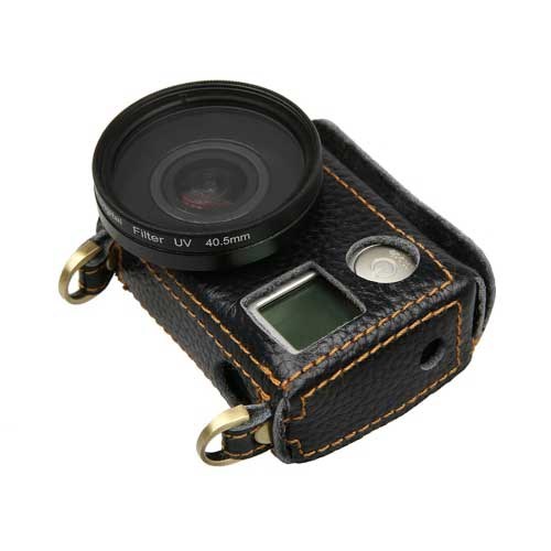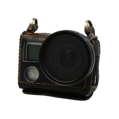 Protective camera case with neck strap for GoPro HERO4. The design is made of genuine durable cowhide leather with exterior stitching and practical details.