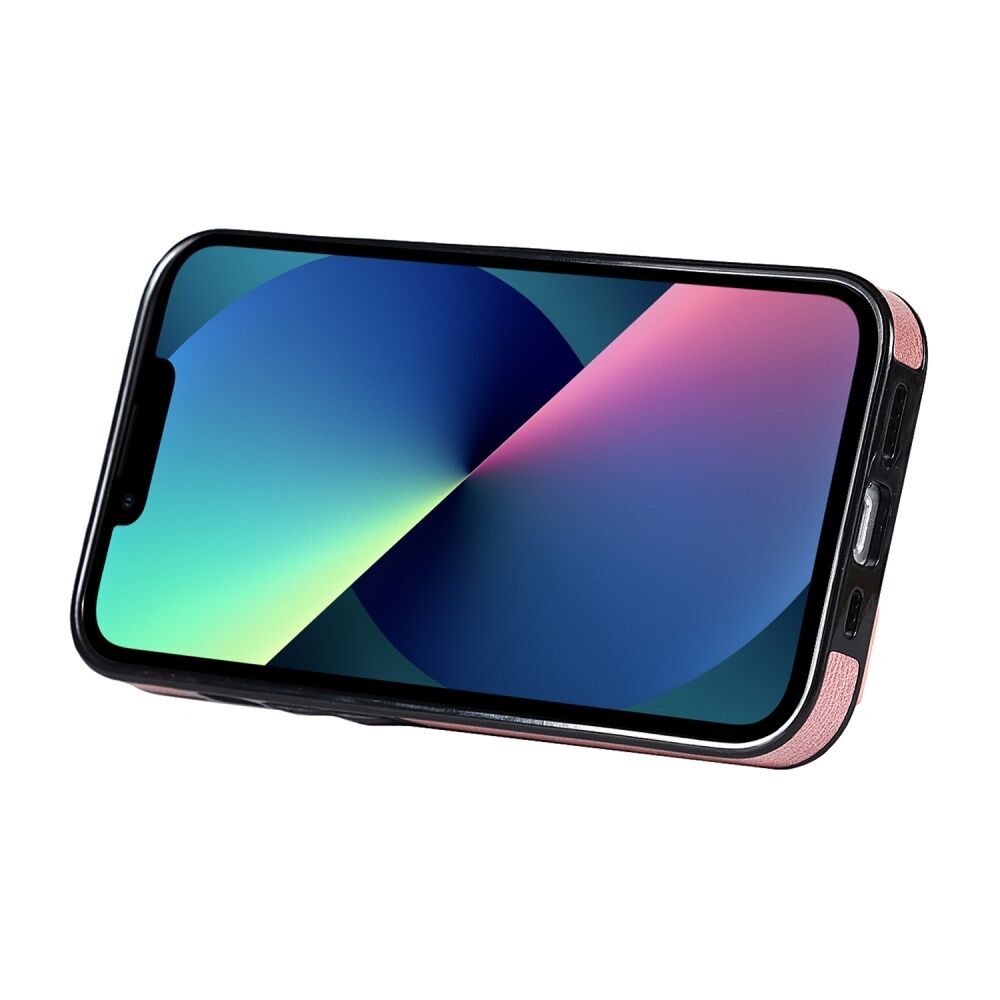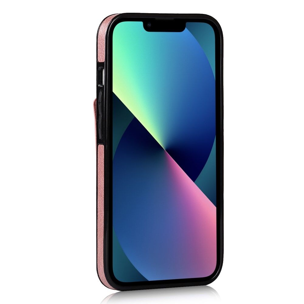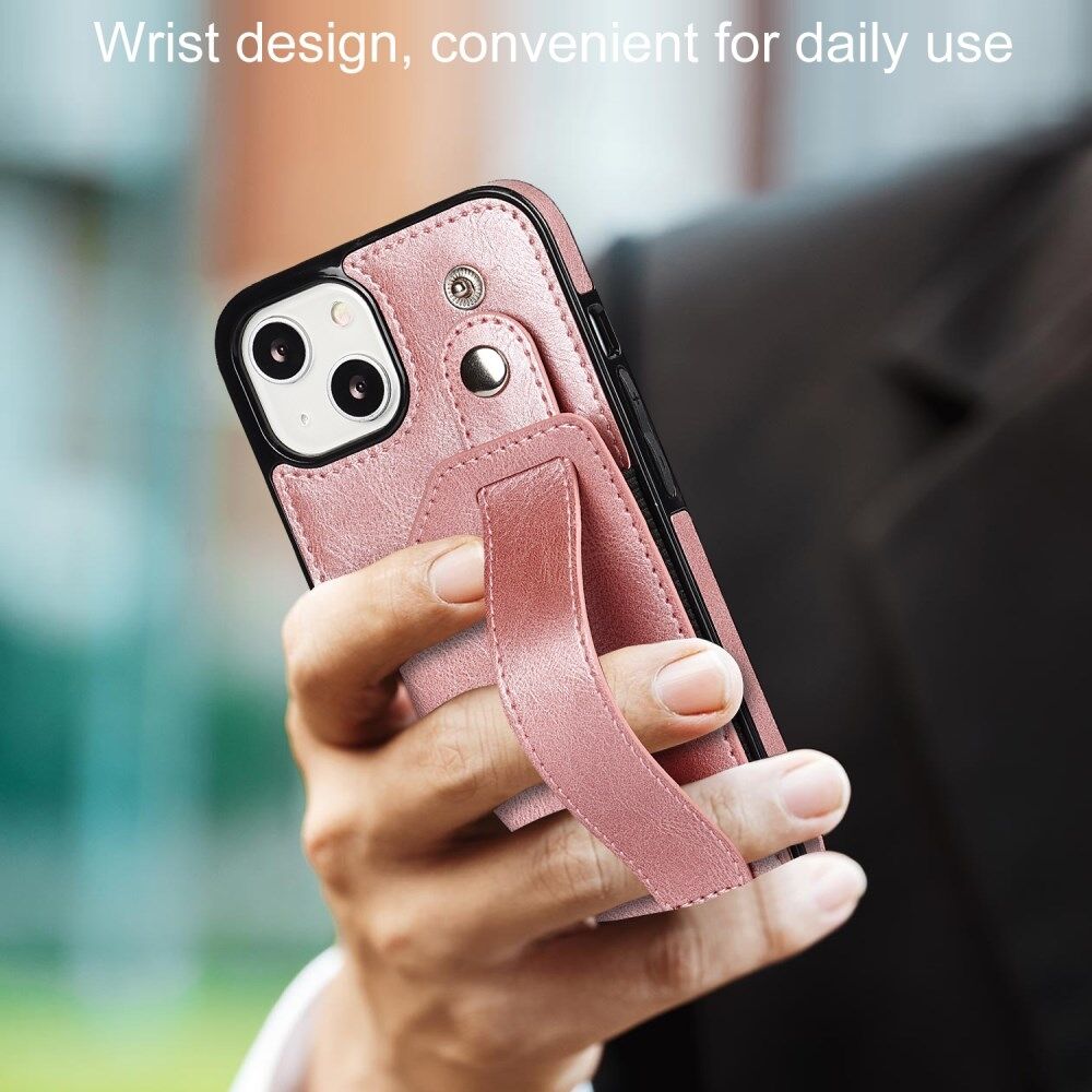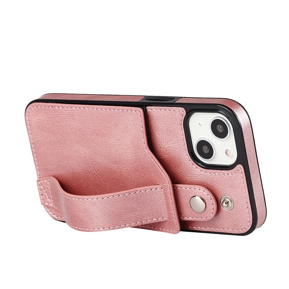 Hand Strap Kickstand Card Slot Design RFID Blocking Function PU Leather Coated TPU Phone Case for iPhone 13 mini 5.4 inch - Rose Gold