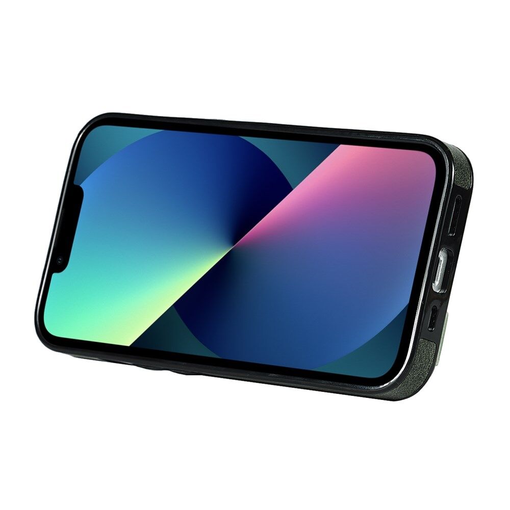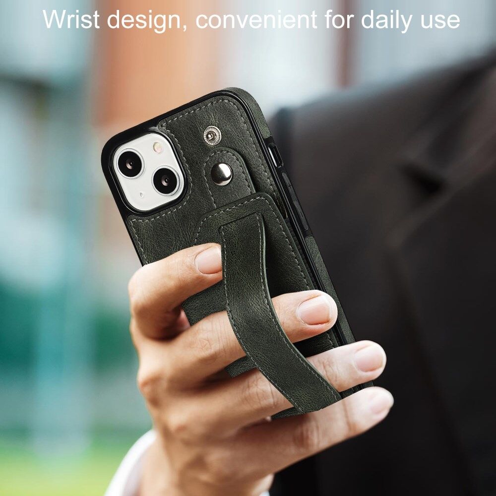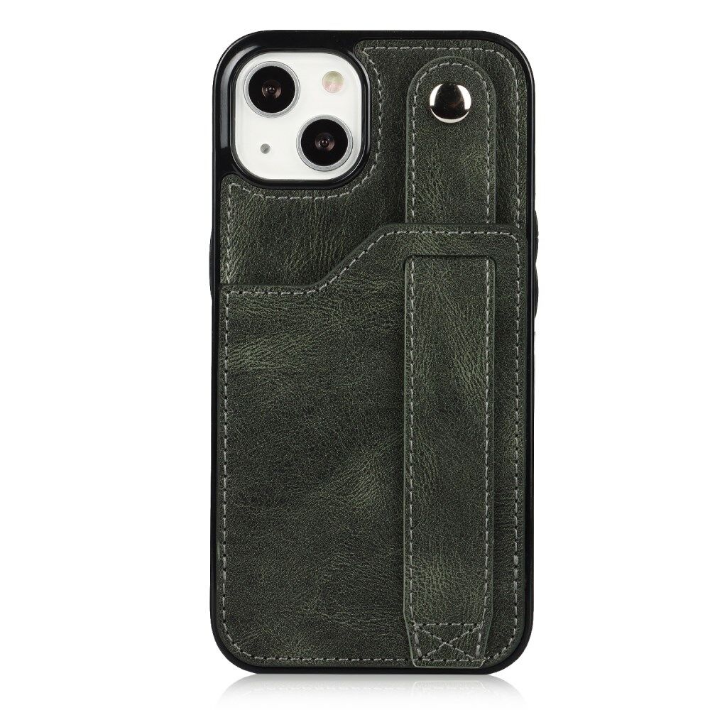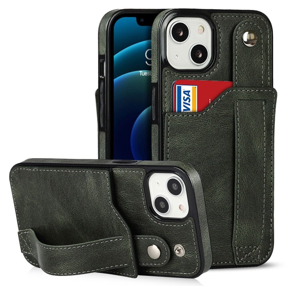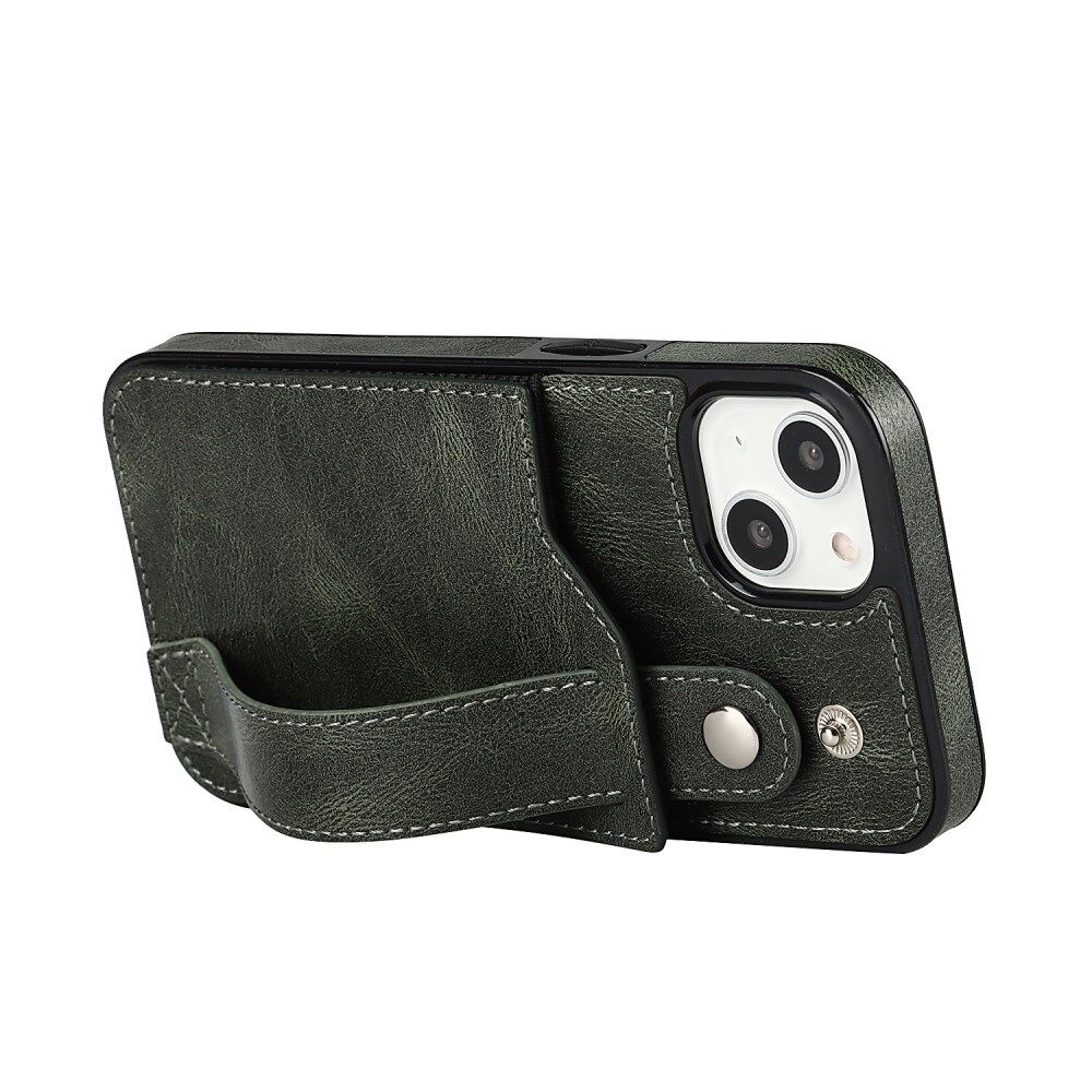 Hand Strap Kickstand Card Slot Design RFID Blocking Function PU Leather Coated TPU Phone Case for iPhone 13 mini 5.4 inch - Emerald