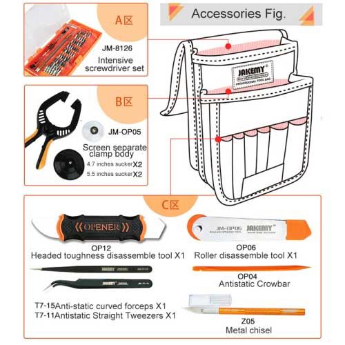 Section A: JAKEMY JM-8126 professional disassemble repair tools kit (1 x length of hard rod + 1 x adapter rod + 1 x handle + 1 x soft handle + 54 x screwdriver heads)