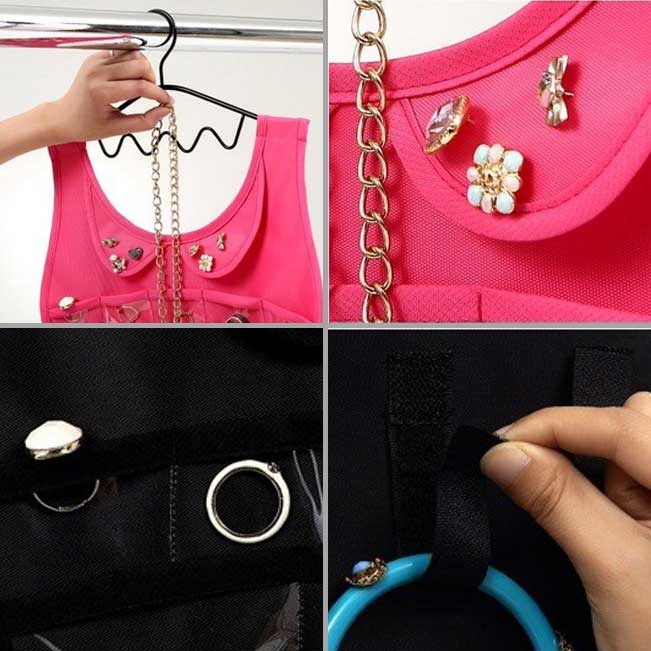 Smart jewelry storage that can hang in your wardrobe. The dress can be folded together to bring in the suitcase on your holiday.