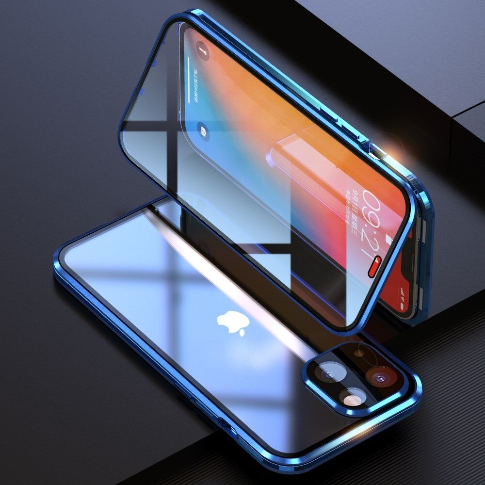 LUPHIE Electroplating Magnetic Adsorption Double-Sided Tempered Glass Metal Bumper Frame Phone Case for iPhone 13 6.1 inch - Blue