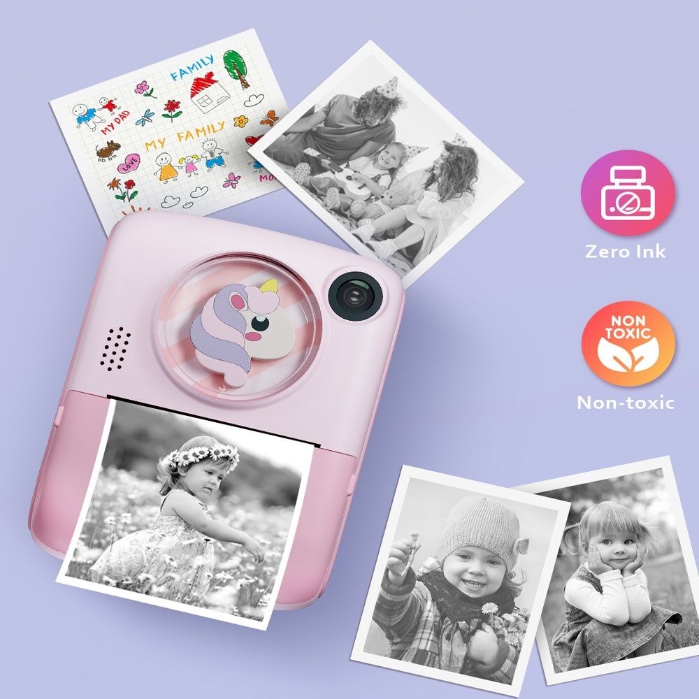M1 Kids Instant Print Camera 2.0" IPS Screen Digital Cartoon Camera HD Selfie Dual Lens Camera Support 1920x1080P Resolution - Pink Horse