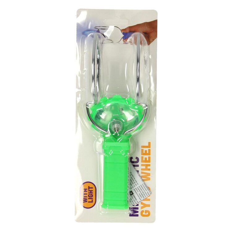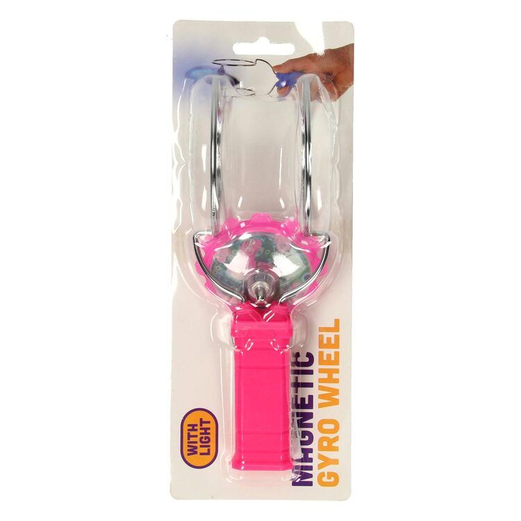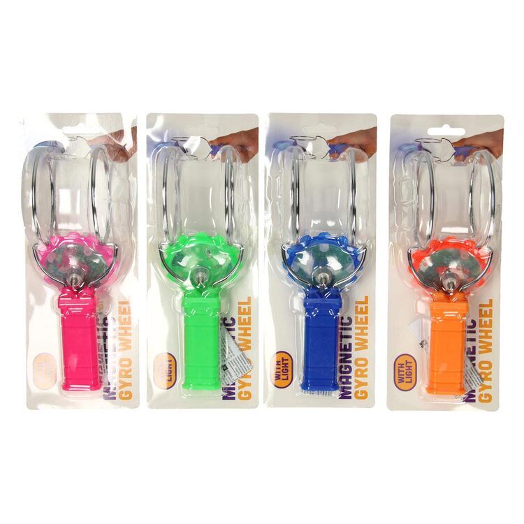 Magnetic Fidget gyro wheel with light. Spin the top through the wheel and the top will stick due to the magnetic function. There are 4 colors: blue, green, orange and pink.