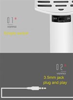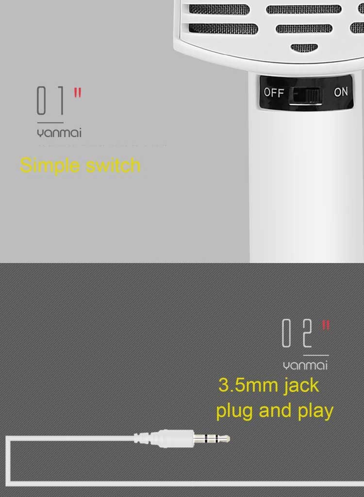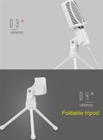 Beautiful white design consisting of a handheld Microphone with on / OFF button and a 2 meter cable and a foldable Tripod stand.