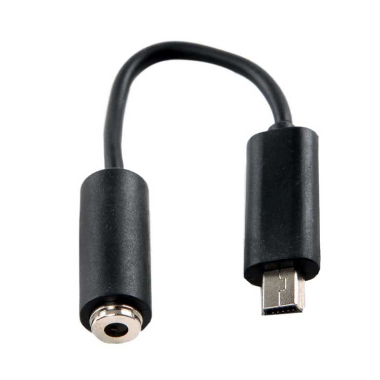 The adapter has a cable length of 12.5 cm and has mini USB plugs on one end and 3.5 mm plugs on the other end.
