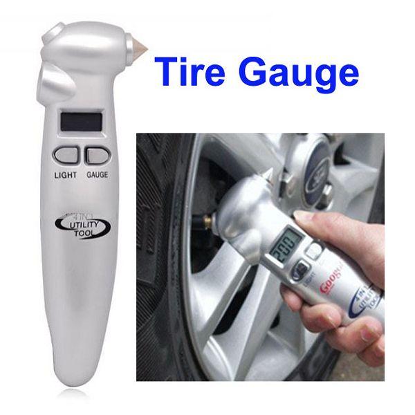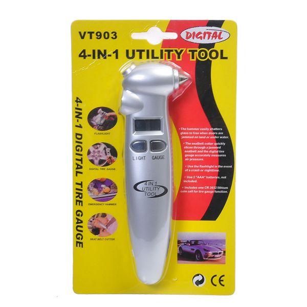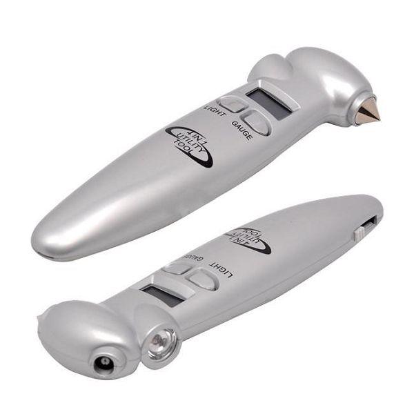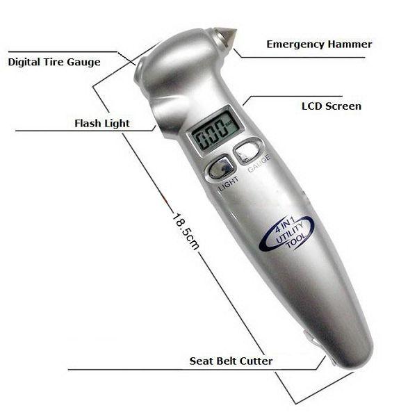 Mini 4-in-1 Emergency Hammer / Safety harness Cutter / Flashlight / and Digital pressure gauge for measuring car tires.