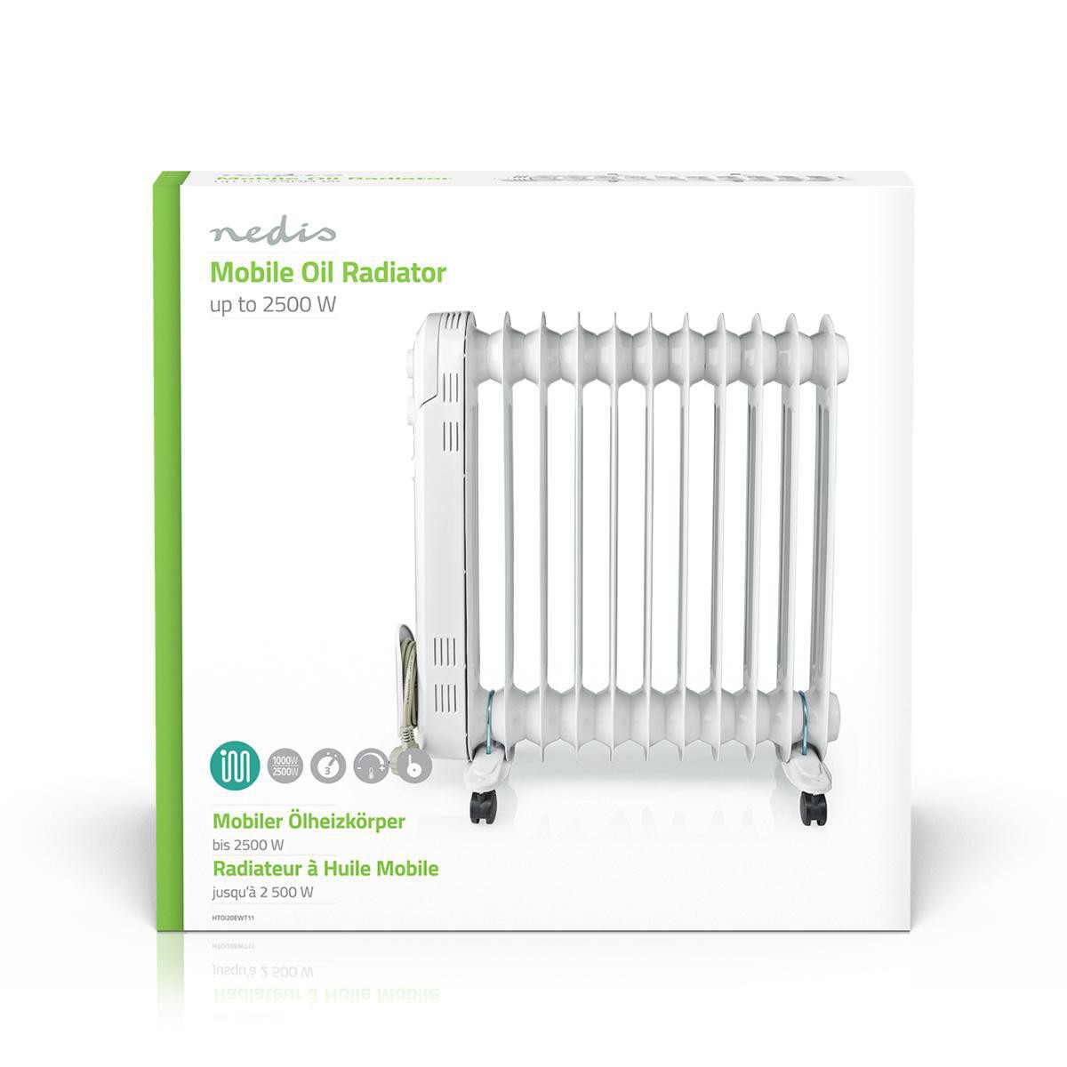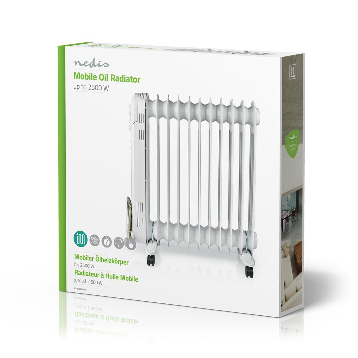 Oil filled mobile radiator as an additional and comfortable heat source that is silent and efficient. The radiator is equipped with three power settings and a thermostat for setting the desired temperature. The radiator is easy to move around with its easy-to-drive wheels and a grip that makes it a mobile heating solution that fits even in the smallest spaces.