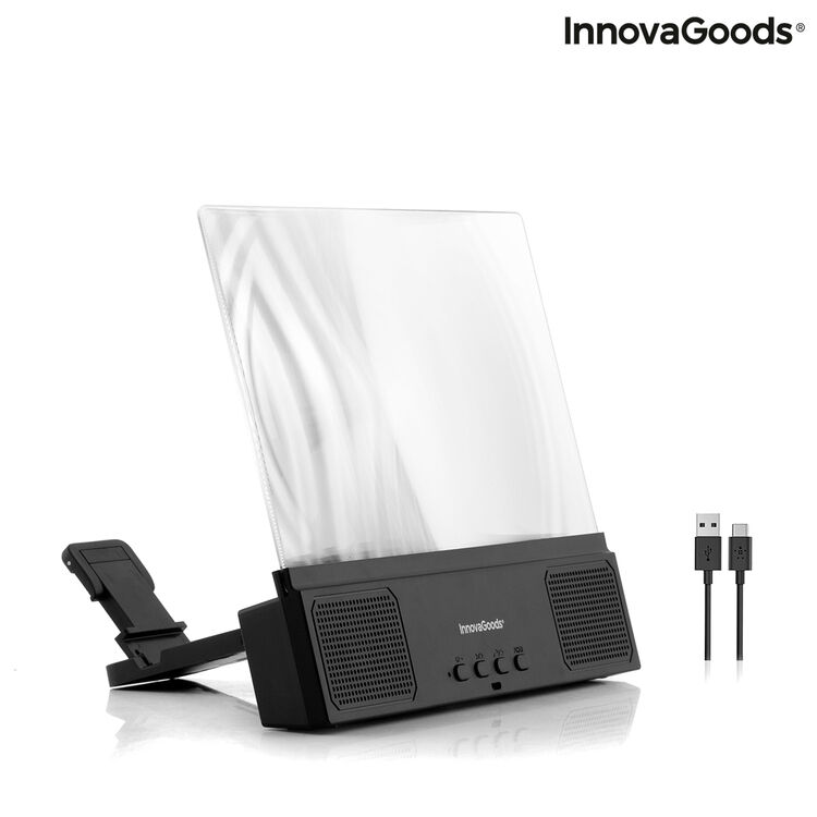 A mobile phone screen amplifier with speaker that enables images projected from a mobile phone to be enlarged for a clearer and more satisfying viewing of series, films, cartoons, videos, photos, videocalls, etc. Ideal for enjoying better and more convenient viewing of content on a mobile phone anywhere and at any time. This screen amplifier is rechargeable, lightweight and portable, which makes it easy to use, transport and store without the hassle of cables and plugs. It has many benefits and advantages, as it can be used to entertain children with cartoons while they eat, to watch sports competitions with friends, to watch a film or series in bed before going to sleep, etc. It is also very easy to use and has a BT function, microphone and speaker with adjustable volume. The acrylic viewing screen measures 12" and has an amplification of x3. The mobile phone holder is adjustable and has a maximum width of 7.5 cm, making it suitable for any mobile. Includes USB to micro USB charging cable.