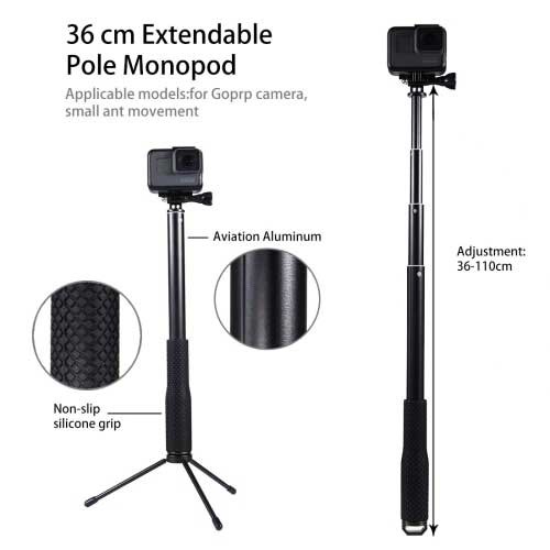 A Monopod with a comfortable non-slip silicone grip that extends from 36-110 cm and can be used with both your smartphone and your action camera.