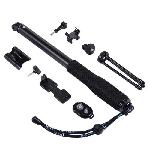 This great smart set is a combined Selfie Rod and Monopod with Tripod, Remote control and Mobile holder for Smartphone and GoPro. Remote control is suitable for both iOS and Android smartphones, but does not work with GoPro cameras.