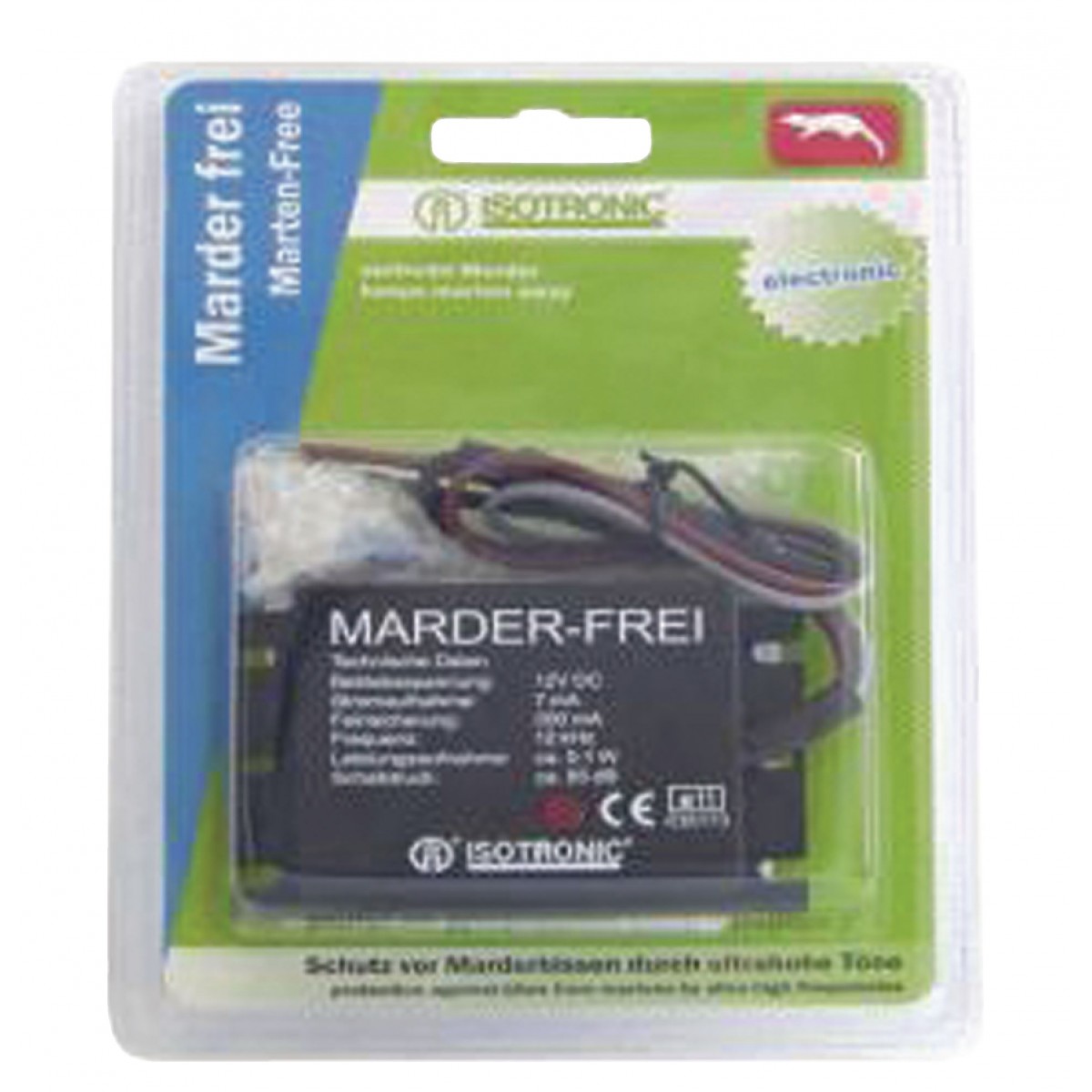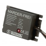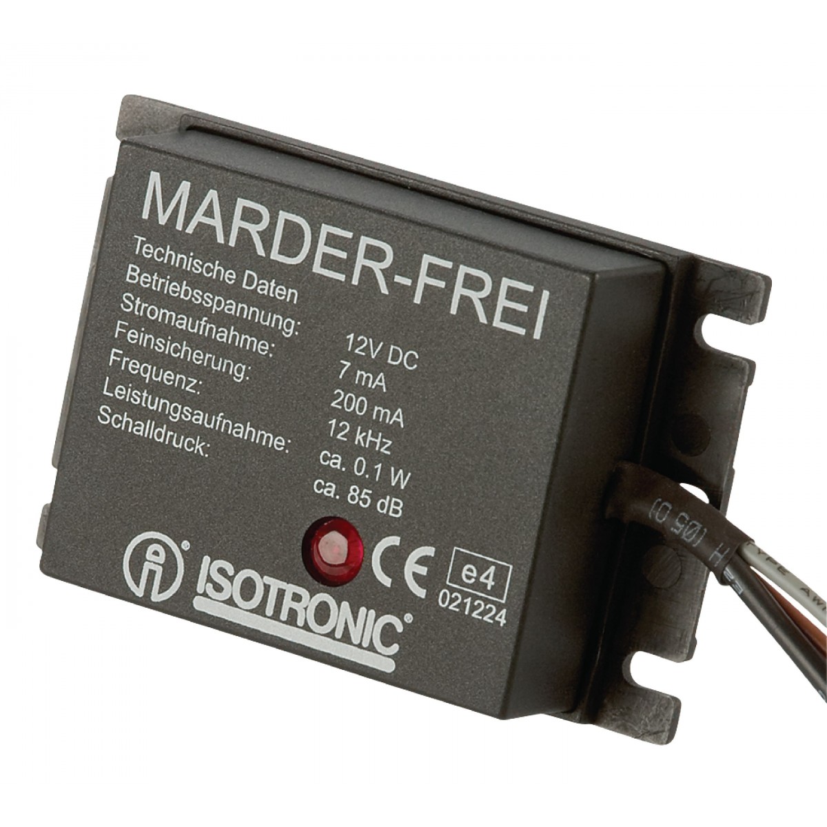 The marten-free device generates an acoustic signal with a frequency of 12 kHz in 15-second intervals. This ultra high frequency is sensed by the martens as perturbing and nasty, so they flee from the vehicle the device is installed into.