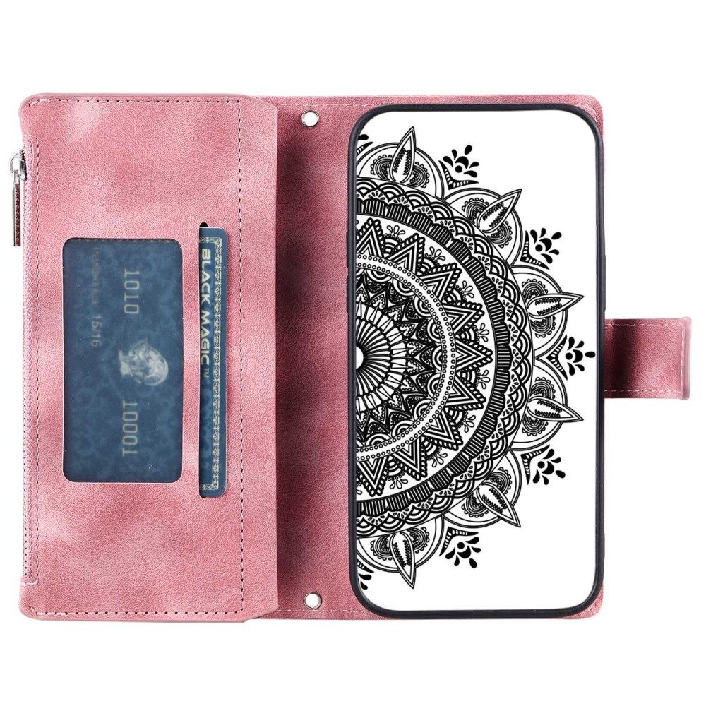 Phone Shell for Samsung Galaxy A32 5G / M32 5G, Mandala Flower Imprinted PU Leather Cover Stand with Multiple Card Slots Zipper Pocket Wallet Case - Pink