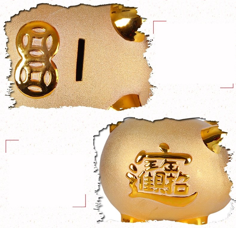 The piggy bank is made of ceramic and comes with a number of beautiful Chinese golden ornaments