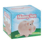 Piggy bank in the shape of a pig. The piggy bank can be opened / closed at the bottom with a plastic stopper.