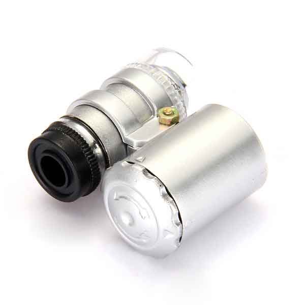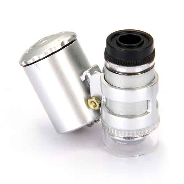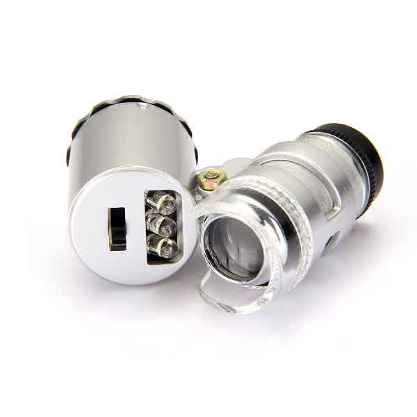 Mini 3-LED light illuminates 60x microscope used for eg currency evaluation;