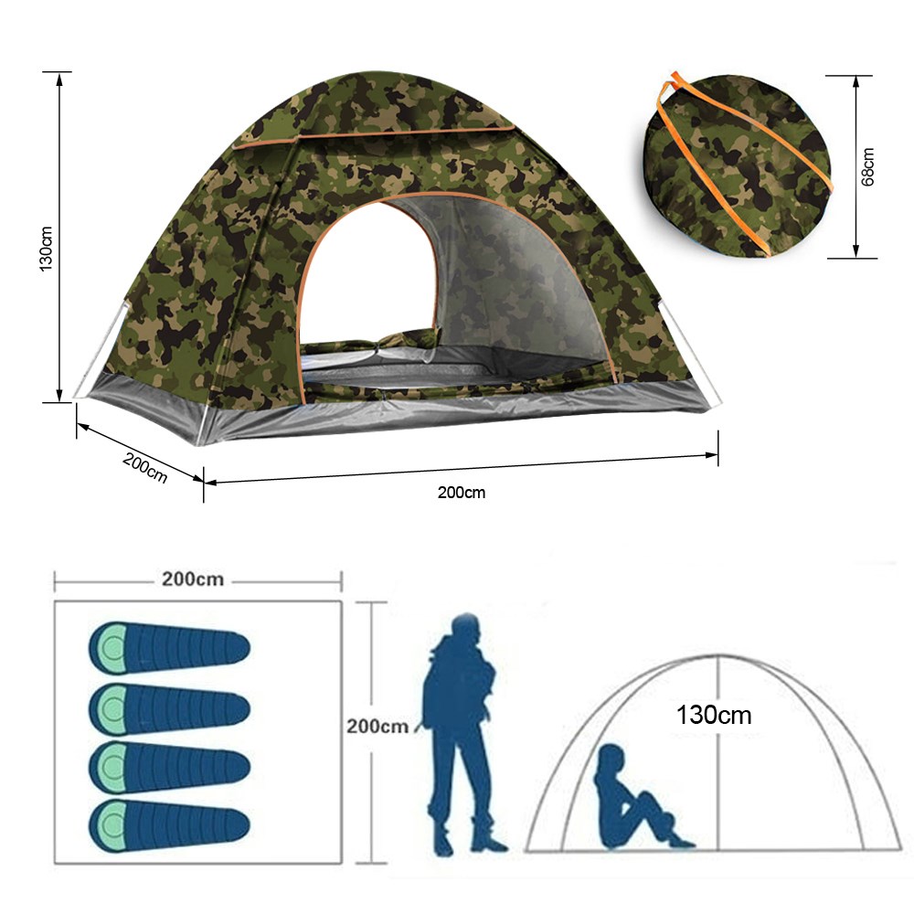 The tent unfolds automatically and is fixed with 8 metal wire picks. This tent is 2 x 2 meters and 1.35 meters in height, and is for 3-4 people.