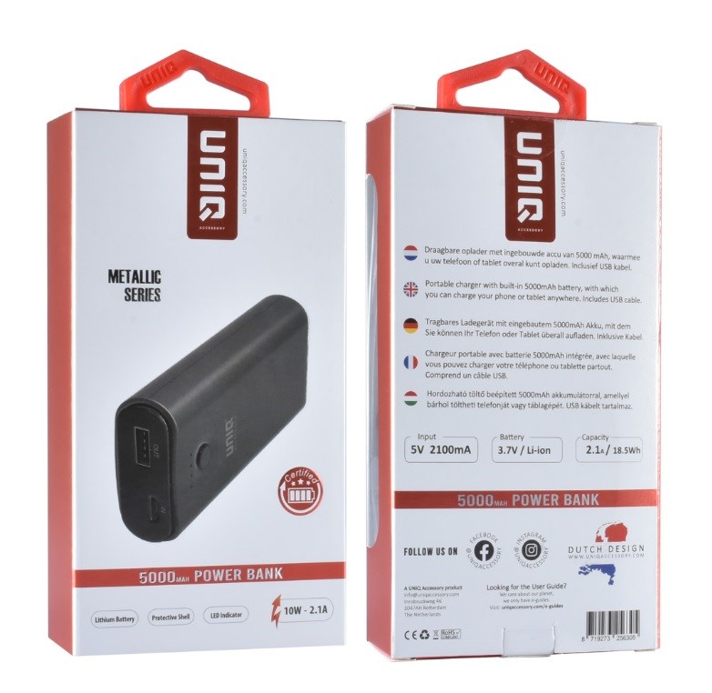 Powerbank offers a stylish design that fits in the hand. The power bank has a matt metal front and velvety rubber on the sides and bottom. It has a large capacity of 10000 mAh.
