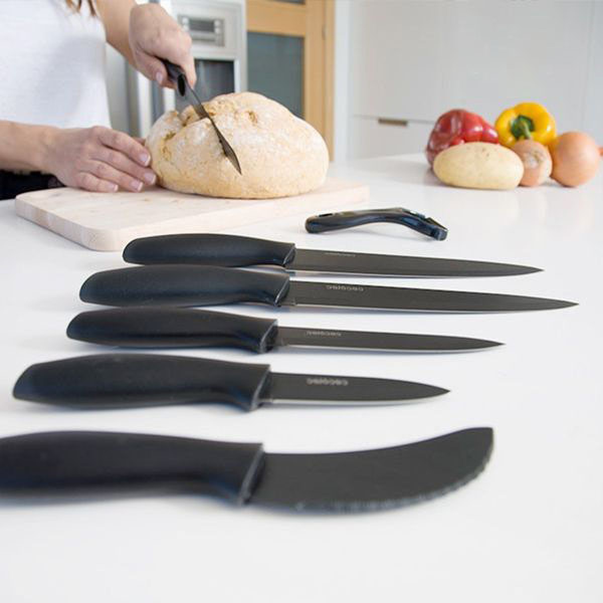 Bravissima Kitchen Titanium Knife Set contains 7 parts for every purpose in the kitchen.